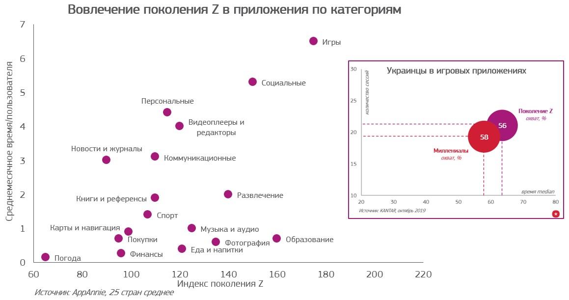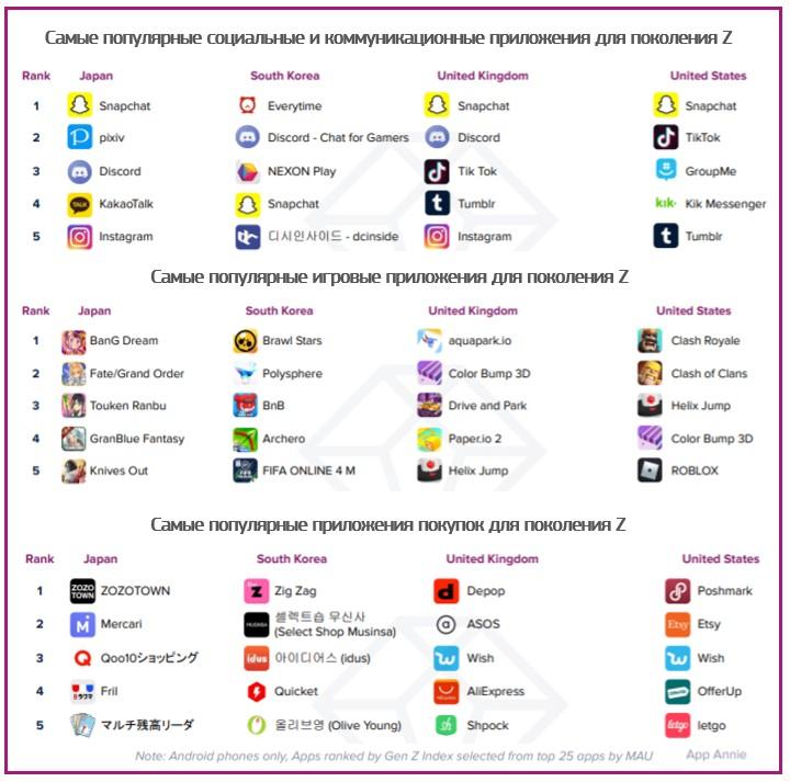 Глобально количество времени, проведенного в самых используемых приложениях, почти одинаковое у миллениалов и поколения Z, но последние все же лидируют по количеству сеансов. В то же время они меньше, чем миллениалы, проводят времени в играх, хотя это и остается лидирующей по популярности категорией приложений.
