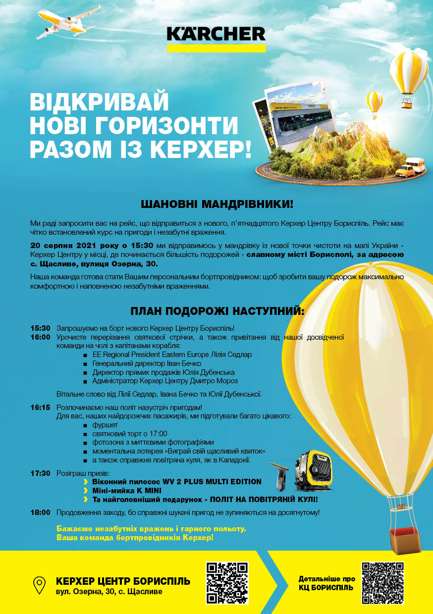 Кроме бизнес-части, гостей ожидает яркая программа открытия фирменного магазина Керхер Центр Борисполь. Поскольку именно с Борисполя начинается большинство незабываемых путешествий, мероприятие пройдет под соответствующей тематикой – «ОТКРЫВАЙ НОВЫЕ ГОРИЗОНТЫ ВМЕСТЕ С КЕРХЕР!». Участников события ждут незабываемые впечатления от шоу-программы с настоящим воздушным шаром. А в самый разгар торжественного события среди участников праздника разыграют ценные призы, среди которых оконный пылесос Karcher WV 2 PLUS MULTI EDITION, с которым мойка окон превратится в новое хобби, и мини-мойка K MINI, которая станет незаменимым помощником в уходе за автомобилем. Но это не все! Тех, кто совершит покупку в Керхер Центре Борисполь на сумму от 1000 грн, будет ожидать розыгрыш полета на воздушном шаре.