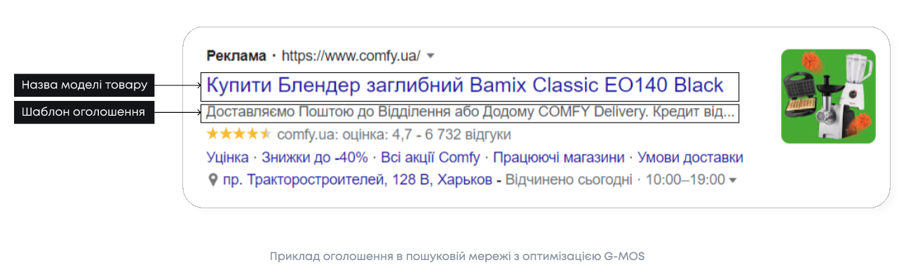 Благодаря автоматическому обновлению в кампаниях, созданных через G-MOS, в рекламе всегда представлена актуальная информация о наличии товара и его стоимости.