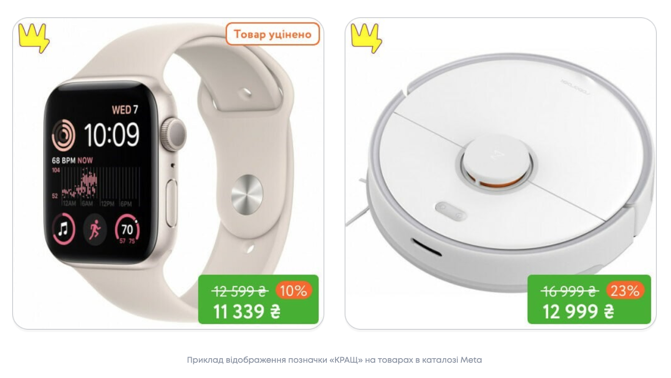 Главной целью было рассказать о КРАЩ наибольшему количеству потребителей на самых популярных площадках. Конечно, не обошли стороной и Facebook. Чтобы пользователи соцсети могли легко различать товары-КРАЩ среди других, использовали свою внутреннюю разработку — Promodo Feed Optimizer. С его помощью добавили к изображению каждого товара с определенным признаком в custom label фирменную отметку «КРАЩ».