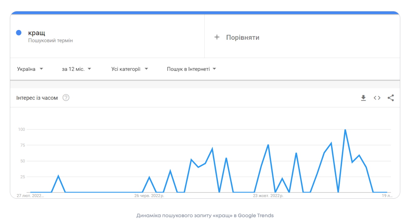 Динамика Google Trends также подтвердила, что выбранная стратегия способствовала росту знания о товарных предложениях «КРАЩ». В течение кампании пользователи начали активно использовать поисковые запросы «товары кращ», «кращ комфи» и т. д.