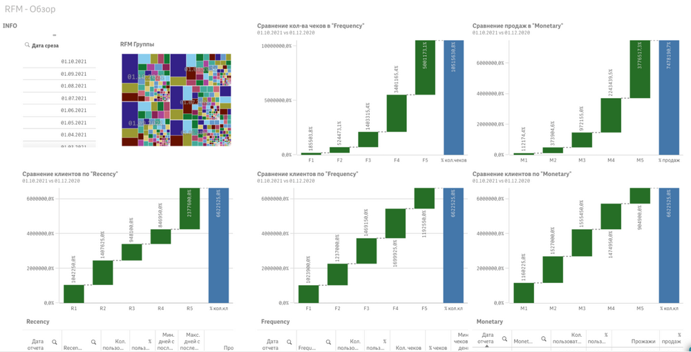 После прописания механики программы и запуска всех каналов коммуникации, необходимо измерить отклик пользователей и показатели эффективности маркетинговых активностей. Через систему ABM Loyalty можно получать отчеты, которые создаются через платформу Qlik. На изображении ниже показан RFM-отчет. Он помогает сегментировать клиентскую базу по разным параметрам: давности, частотой и суммой покупок. Этот анализ помогает понять аудиторию и создавать акции, которые будут ей интересны.