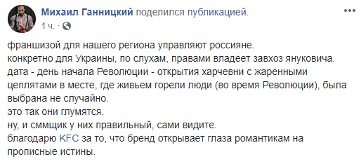 Шеф-редактор информагентства УНИАН Михаил Ганницкий на своей странице в Facebook уточнил, что россияне управляют франшизой KFC для Украины, попутно предположив, что открытие ресторана в годовщину Революции Достоинства – не случайность. «По слухам, правами владеет завхоз януковича. Дата – день начала Революции – открытия харчевни с жаренными цеплятами в месте, где живьем горели люди (во время Революции), была выбрана не случайно. Это так они глумятся», – написал он (орфография автора сохранена – прим.ред.).