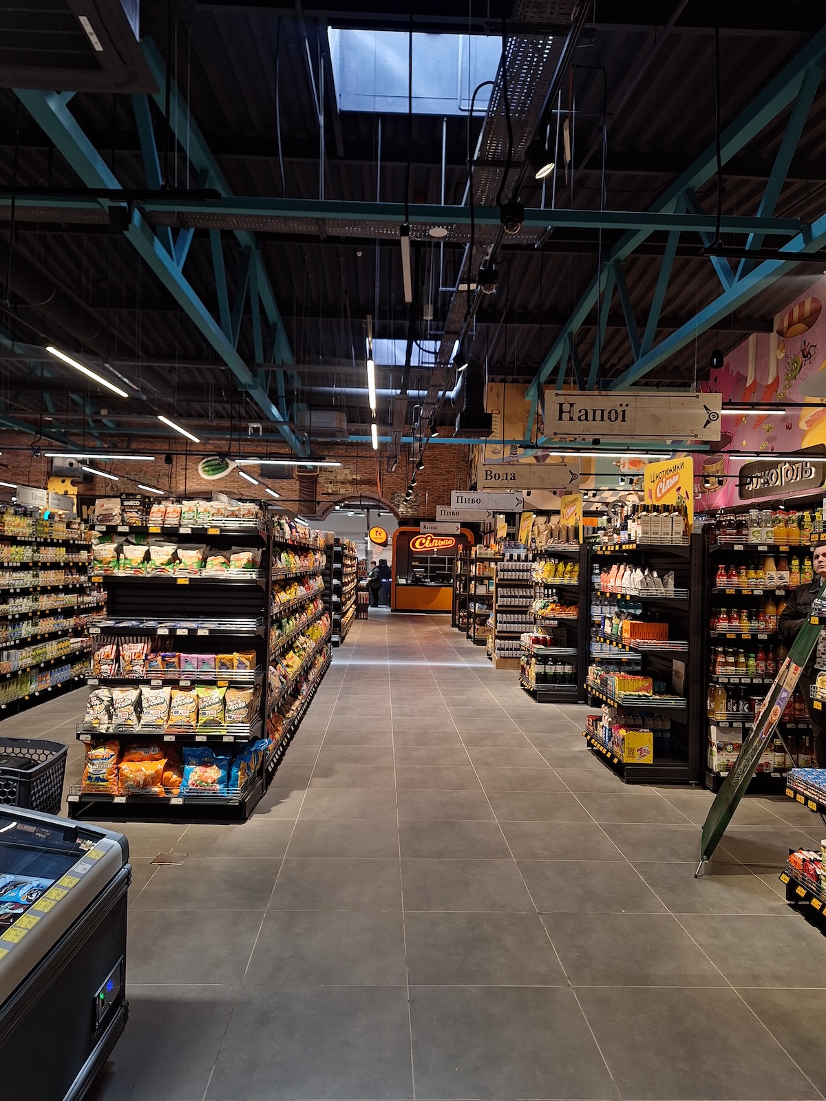 Команда Сільпо соединила в дизайне магазина стимпанк и лофт: кирпич, металл, состаренное дерево и бетон. Супермаркет площадью 1368 кв. м наполнен необычными предметами, которые будто балансируют на грани функциональности и творческого хаоса.