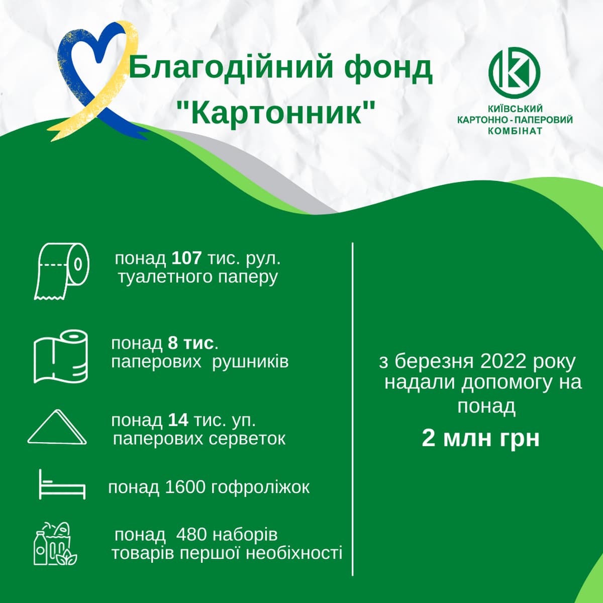 Также наборы первой необходимости благотворительного фонда компании – «Картонник» с продуктами питания и продукцией комбината смогли получить более 480 семей в пострадавших регионах нашей страны: городах Чернигов, Харьков, городах и селах Киевщины.