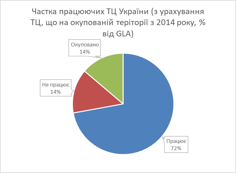Это составляет 72% всех торговых площадей с учетом находящихся на временно оккупированной территории ТЦ. Не работающими остаются 14% торговых площадей (804 000 кв. м), большая часть которых повреждена. Без учета ТЦ на оккупированной территории работают на начало июня 84% площадей в ТЦ.