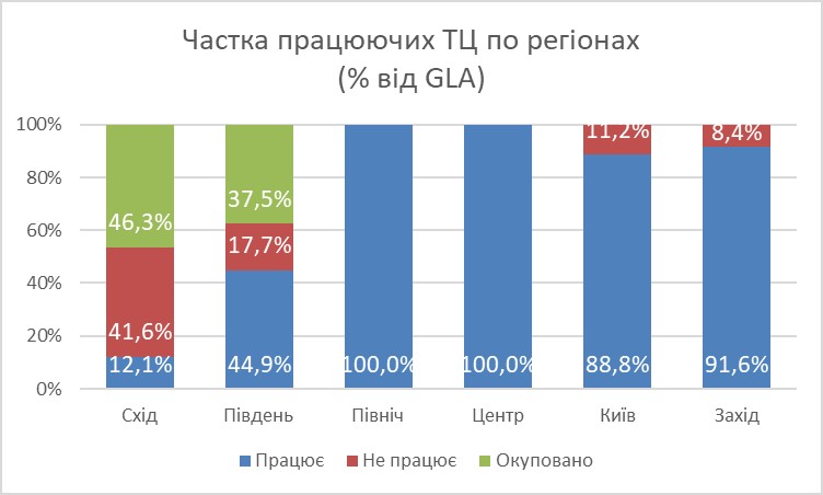 Наибольшая часть не работающих ТЦ зафиксирована на востоке Украины. Здесь работает только 12% торговых площадей, 42% не работают и 46% находятся на оккупированной территории. Меньше половины торговых площадей работает также на юге (45%). В столице закрытыми остаются пока 11% торговых площадей в ТЦ. Практически все ТЦ работают на севере, западе и в центре страны. Это связано, в первую очередь, с отсутствием разрушений.