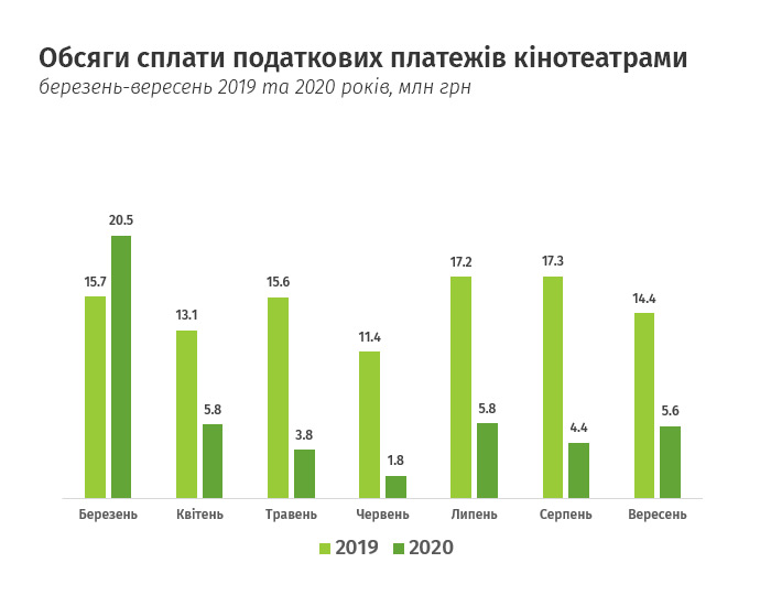 Даже после возобновления работы кинотеатров они платят гораздо меньше налогов, чем до начала карантина. В июле-сентябре 2020 представители этого бизнеса заплатили в бюджеты всех уровней 15,8 млн грн, что почти равно сумме перечисленных средств только за июль 2019 – 17,2 млн грн.