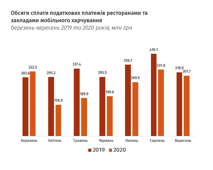 Рестораны и заведения стрит-фуда сократили отчисления в бюджеты на 23% или 535,5 млн грн. Самым тяжелым для представителей этого бизнеса был апрель, после чего началось постепенное восстановление и уже в сентябре рестораны почти вышли на показатели 2019 года.