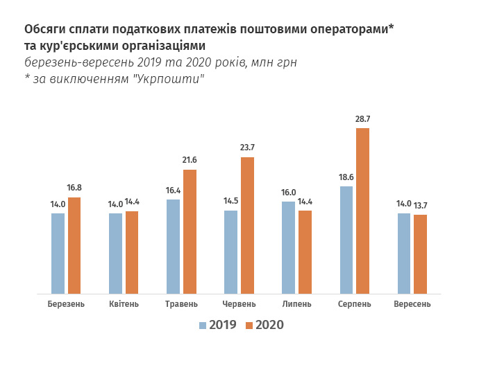 Закрытые магазины непродовольственных товаров стимулировали рост электронной коммерции, особенно в первые два месяца карантина. Соответственно, выросла почтовая и курьерская доставка. За шесть карантинных месяцев компании, работающие в сфере почтовых отправлений (кроме Укрпошта) и служб курьерской доставки, уплатили в бюджет на 24% больше налогов, чем за март-сентябрь 2019 года.