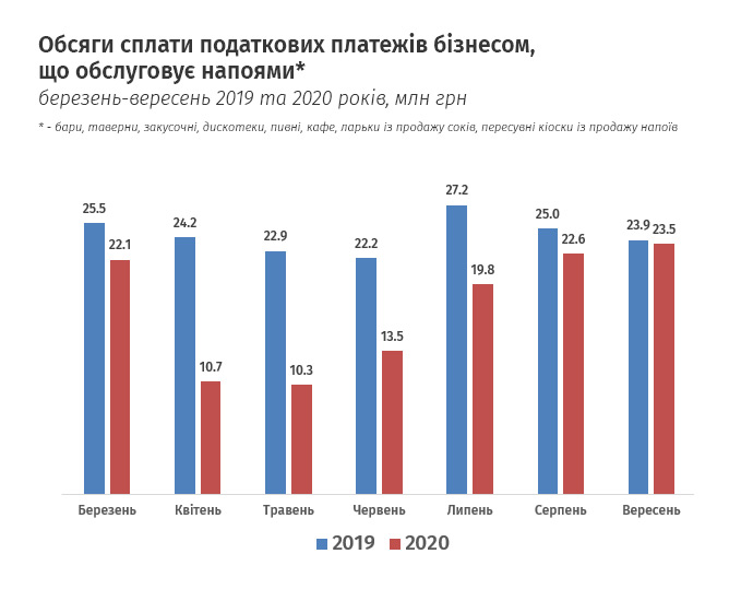 Сопутствующий бизнес – “обслуживание напитками” – уменьшил отчисления на треть. В наиболее тяжелые периоды, апрель-май, от баров, таверн, закусочных, пивных и кафе государство получало ежемесячно по 10 млн грн – 50% от сумм 2019 года.