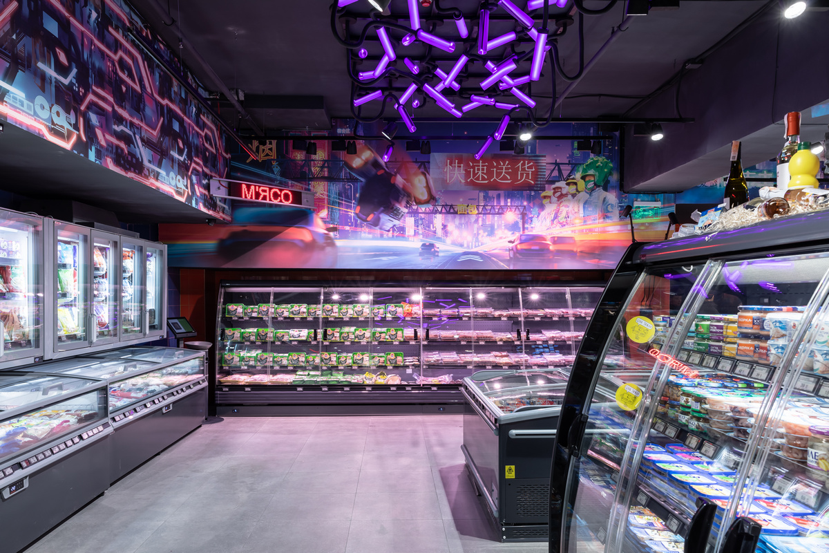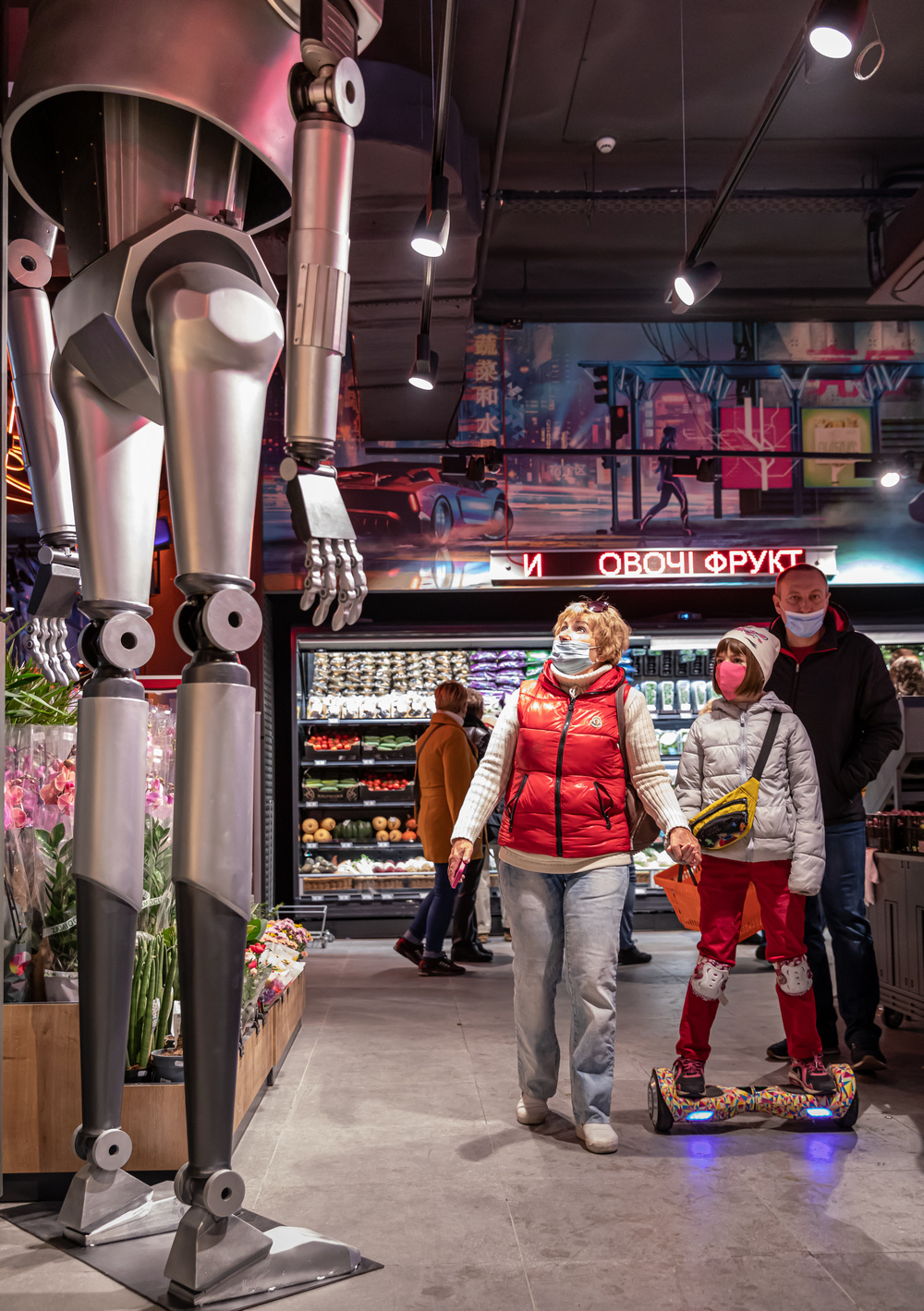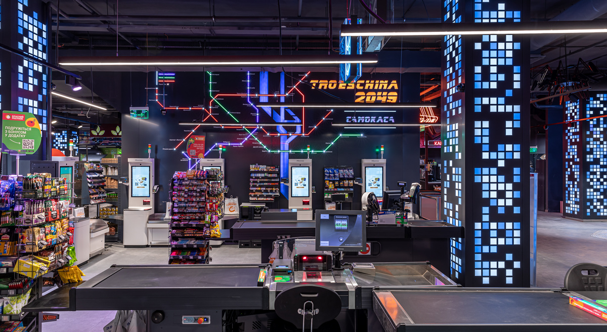 В высокотехнологичном Сільпо в стиле китайского киберпанка (ТЦ Квадрат, ул. Оноре де Бальзака, 91/29 А) атрибуты цифрового будущего встречаются на каждом шагу, например, электронные ценники и надписи на китайском языке, которые дублируют названия отделов и дизайн.