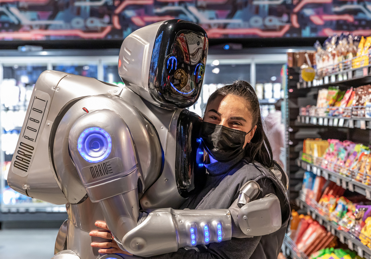 Гостей встречает современный улыбающийся робот-андроид. Это напоминание о том, что даже в цифровом и технологическом мире в любой ситуации нужно оставаться человеком и любить.