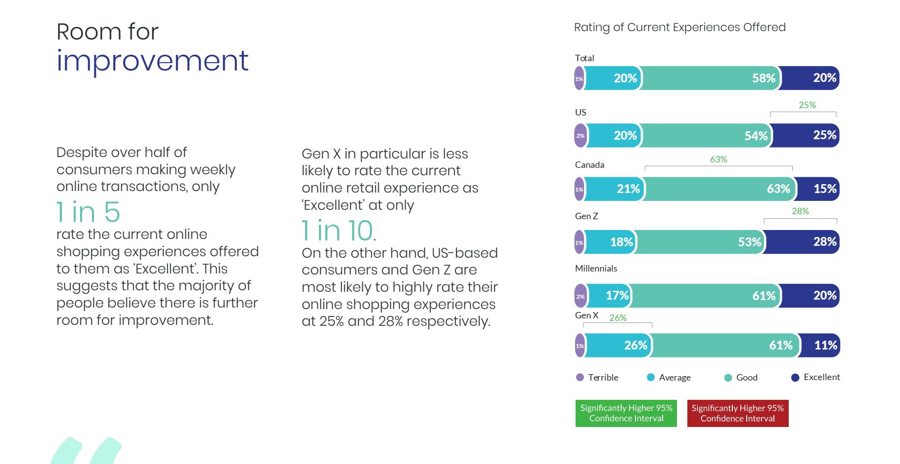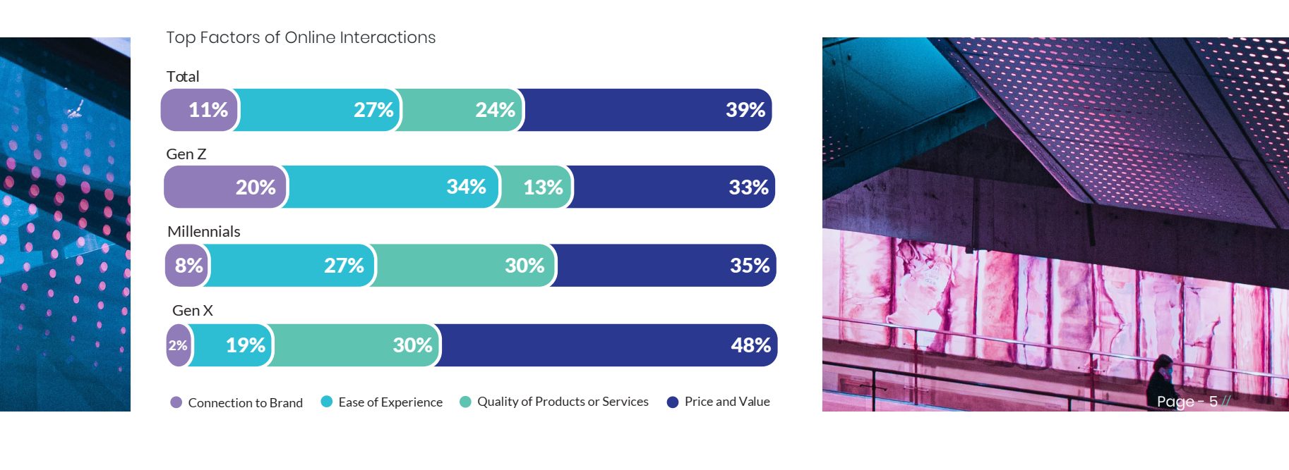 Когда покупателей попросили оценить важность аспектов, которые составляют опыт онлайн-торговли, цена и ценность оказались наиболее важными для всех поколений (39%). Простота использования, в том числе удобная навигация (13%) и удобный дизайн (12%), также стали главными факторами незабываемого онлайн-опыта.