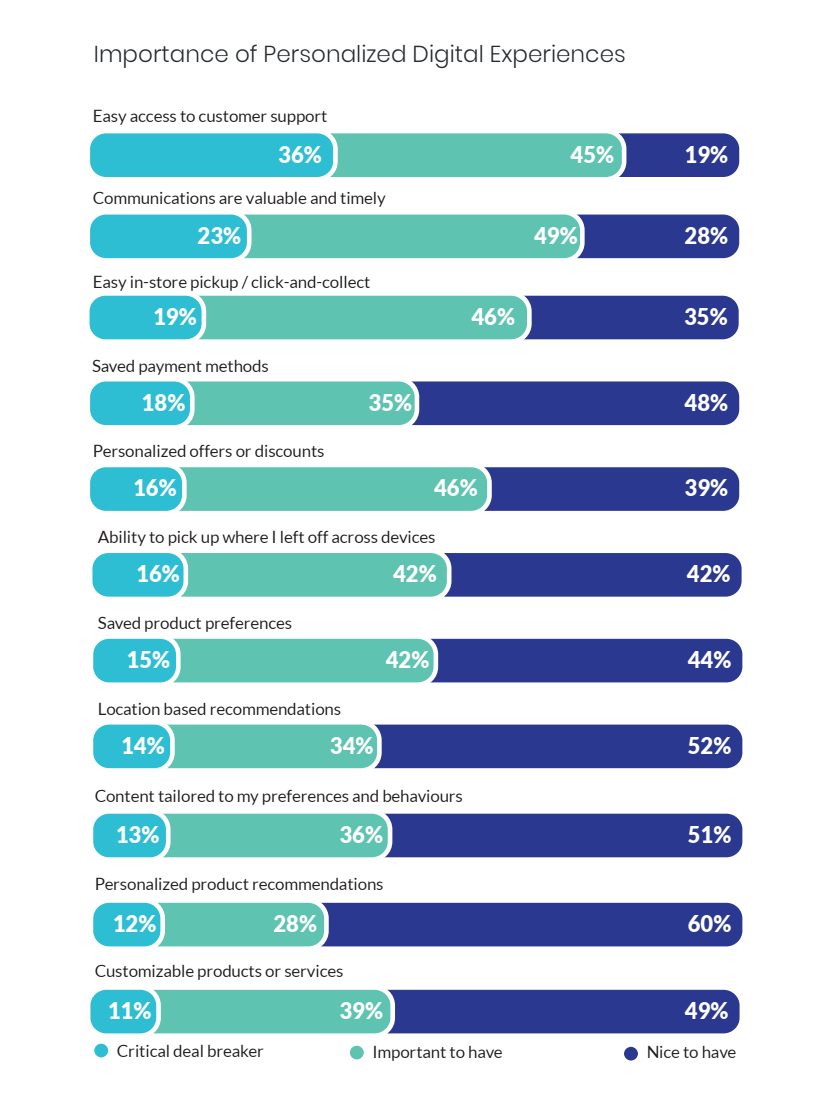 В целом потребители с большей вероятностью будут рассматривать плохой цифровой опыт как важный фактор отказа от покупки. В этом смысле выделяется лишь поколение X, которому не так важен персонализированный опыт онлайн-покупок, такой как рекомендации на основе местоположения, индивидуальный контент и т.п.
