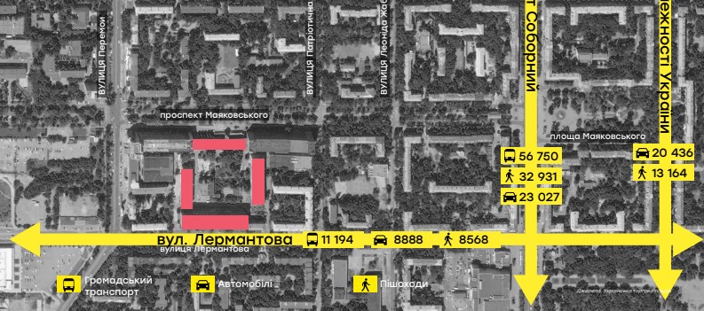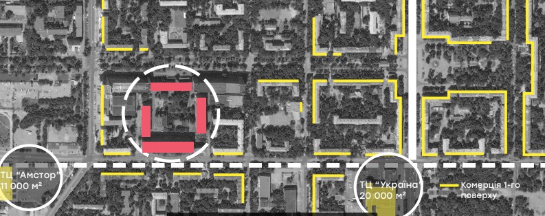 Здание расположено в центральной части города по одной из самых активных улиц города, рядом ТРЦ Украина, дворец спорта «Юность», ТЦ Амстор.