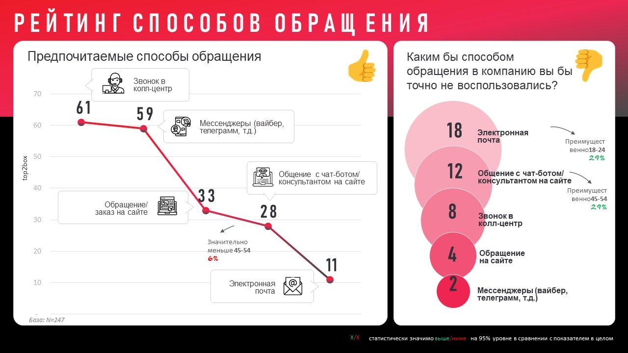 Исследование показало, что в Украине до сих пор телефонный звонок – самый популярный способ связи со службой поддержки. А значит, количество приверженцев старых традиций или привычек в стране больше, чем любителей новых способов общения, например, через мессенджеры. Хотя этот отрыв уже совсем невелик. Бизнесу стоит продолжить работу над омниканальностью, сделать обращение в компанию максимально доступным для всех групп населения – как по телефону, так и с помощью текстовых сообщений. Помимо звонка в колл-центр и общения через мессенджеры, в топ-5 наиболее предпочитаемых каналов обращения входят: сайт, общение с чат-ботом, электронная почта.