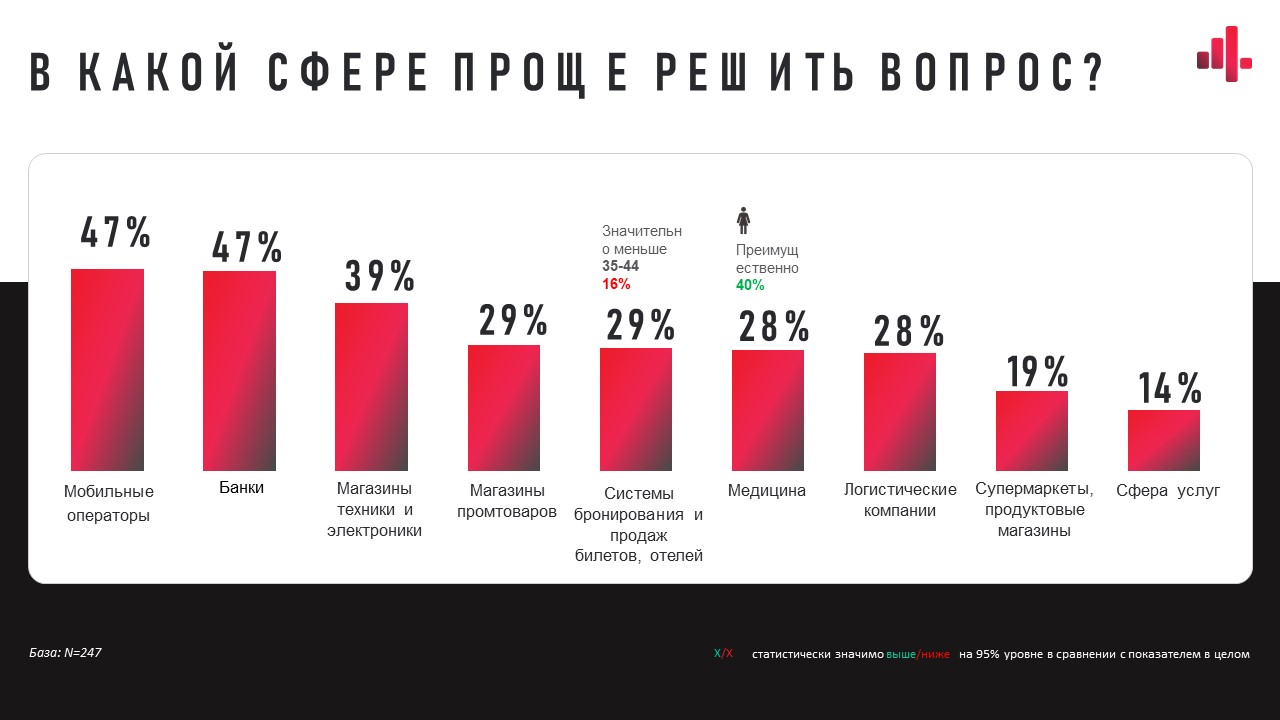 Электронная почта наименее популярна для обращения, но и ее не стоит списывать со счетов, ведь около 10% опрошенных все еще предпочитают е-mail. Книга жалоб и вовсе исчезла из перечня способов получить обратную связь. В 2019 году 4Service Group выявили, что больше трети опрошенных пользовались данным способом донести информацию до руководителей компании и эта цифра только росла. В этом же году книга жалоб и предложений даже не участвовала в опросе.