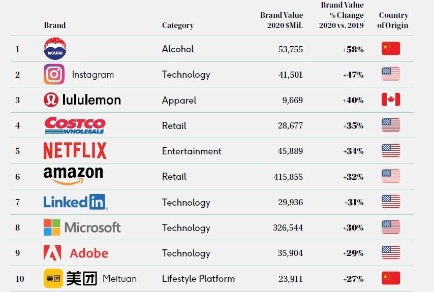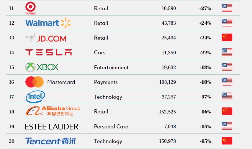Кроме того, пять из топ-20 самых быстрорастущих компаний – китайские бренды, что важно отметить по двум причинам. Во-первых, оцифровка бизнеса для обеспечения удобства клиентов в Китае достигла своего наивысшего уровня. Во-вторых, эти компании – среди 17-ти китайских брендов, которые вошли в глобальный рейтинг, что отражает растущее присутствие китайских брендов в разных категориях.