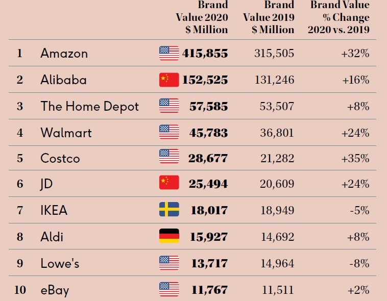 Amazon, Alibaba, Home Depot, Walmart и другие. Кто признан признан самым дорогим глобальным брендом в мировом ритейле.