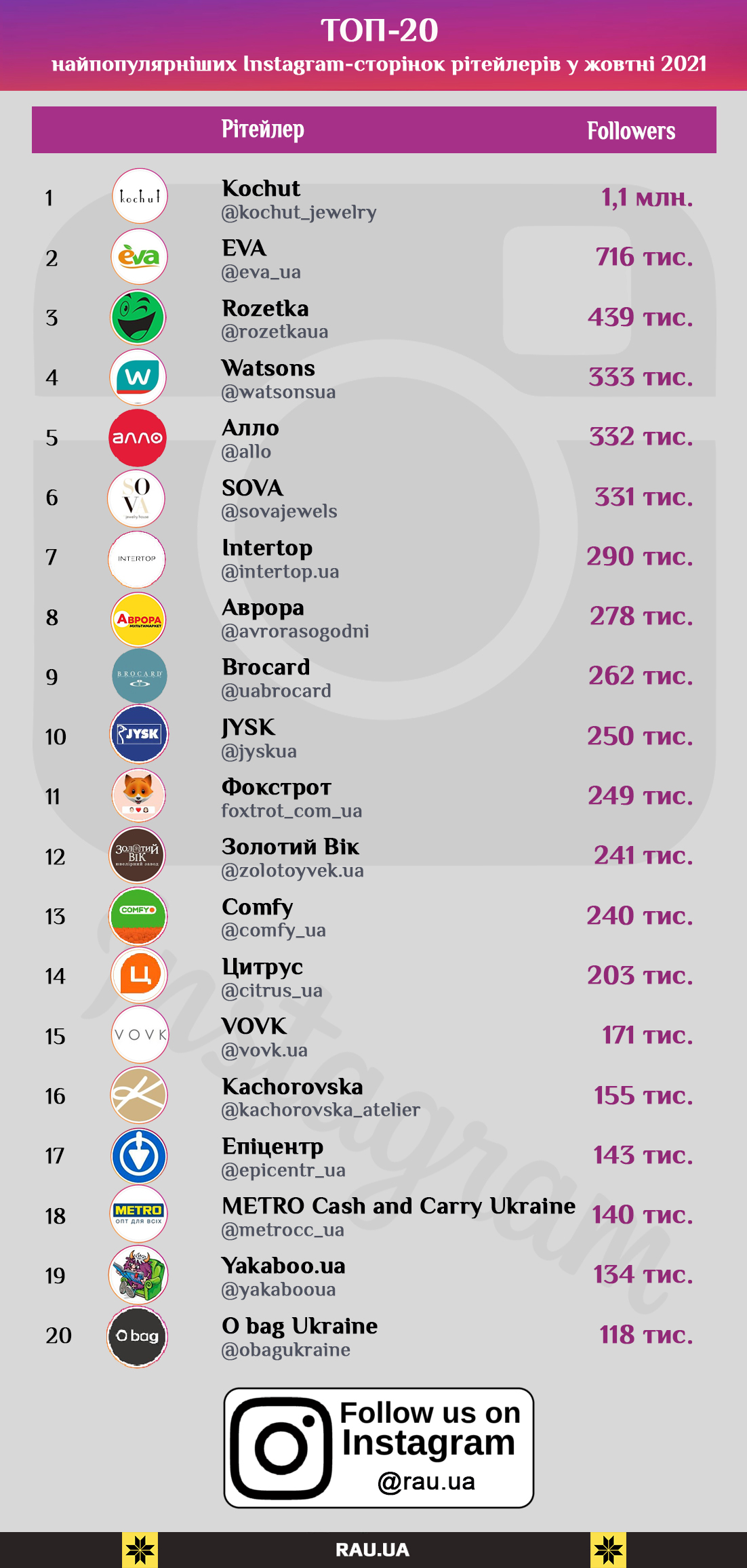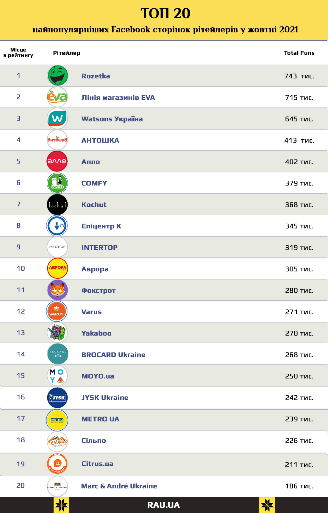 Лидеры соцсетей: топ-20 украинских ритейлеров и ТРЦ в Facebook и Instagram за октябрь 2021 году