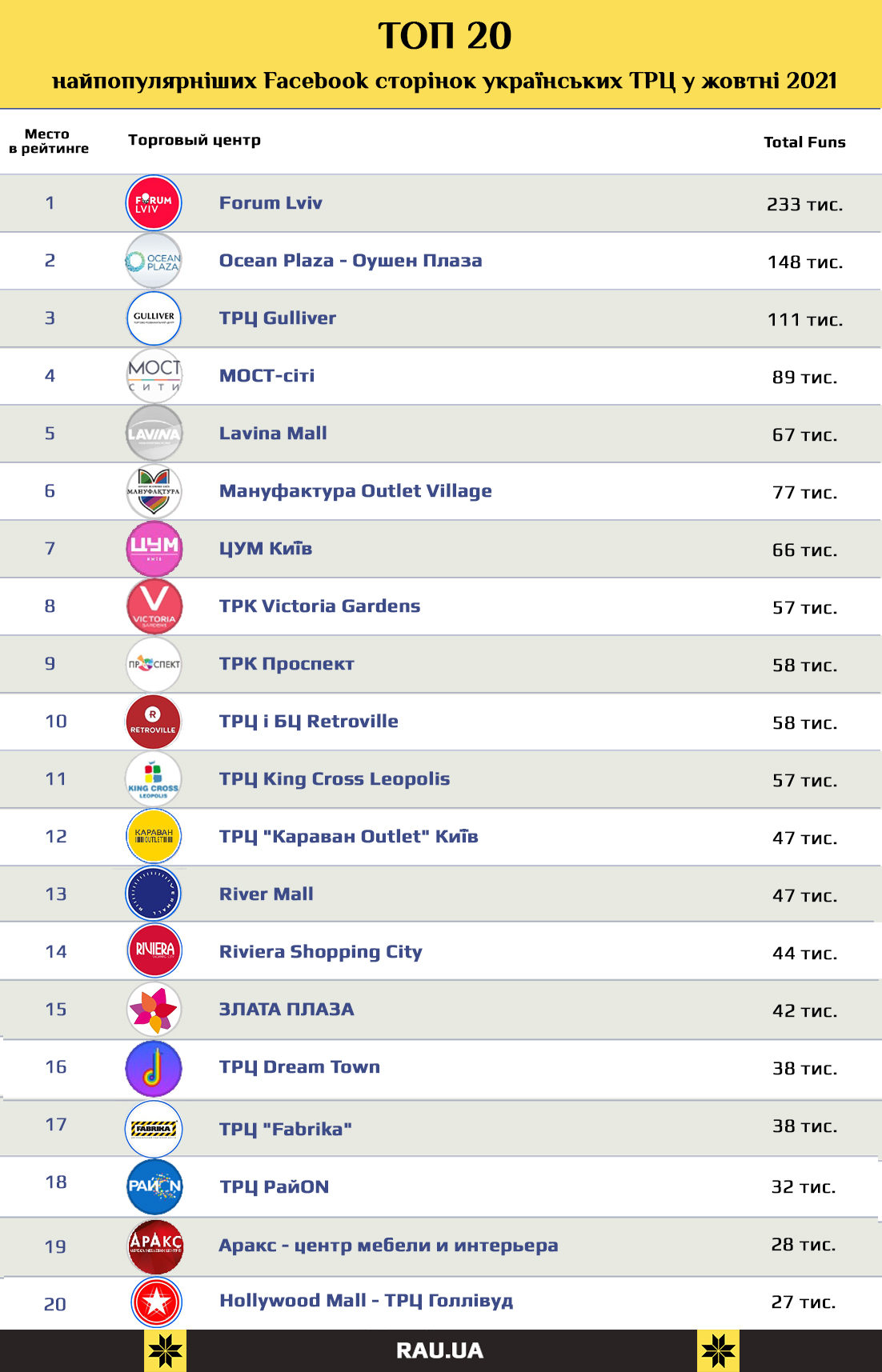 Представляем рейтинг ритейлеров и торговых центров, которые собрали наибольшее количество поклонников в самых популярных соцсетях мира. RAU анализировала страницы методом выборки наиболее крупных и известных розничных игроков и объектов коммерческой недвижимости, а также тех, кто представлен в рейтинге Facebook согласно аналитического сервиса Socialbakers. Если по каким-то причинам ваша страница не попала в финальный топ, пишите нам на e-mail – news@rau.ua.
