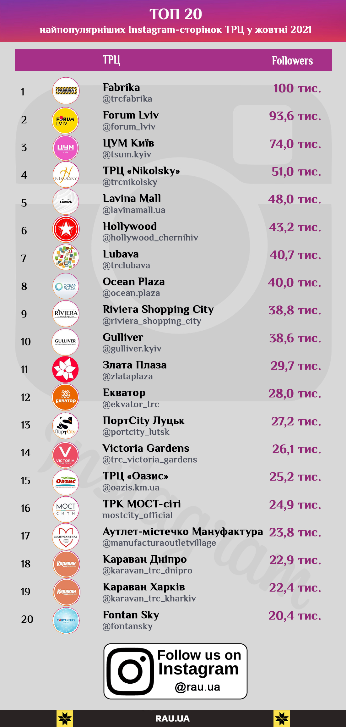 На одной из следующих ступенек еще недавно находился Французский Бульвар , однако его Instagram-страница была заморожена администрацией социальной сети, поэтому харьковский ТРЦ покинул рейтинг. А пока перебивается на резервной странице.