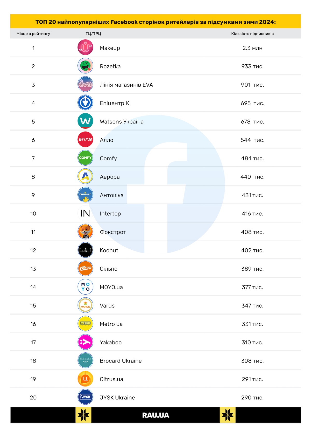 И закрыла топ-20 ритейлеров в Facebook сеть JYSK Ukraine, которая имеет 290 тысяч подписчиков.