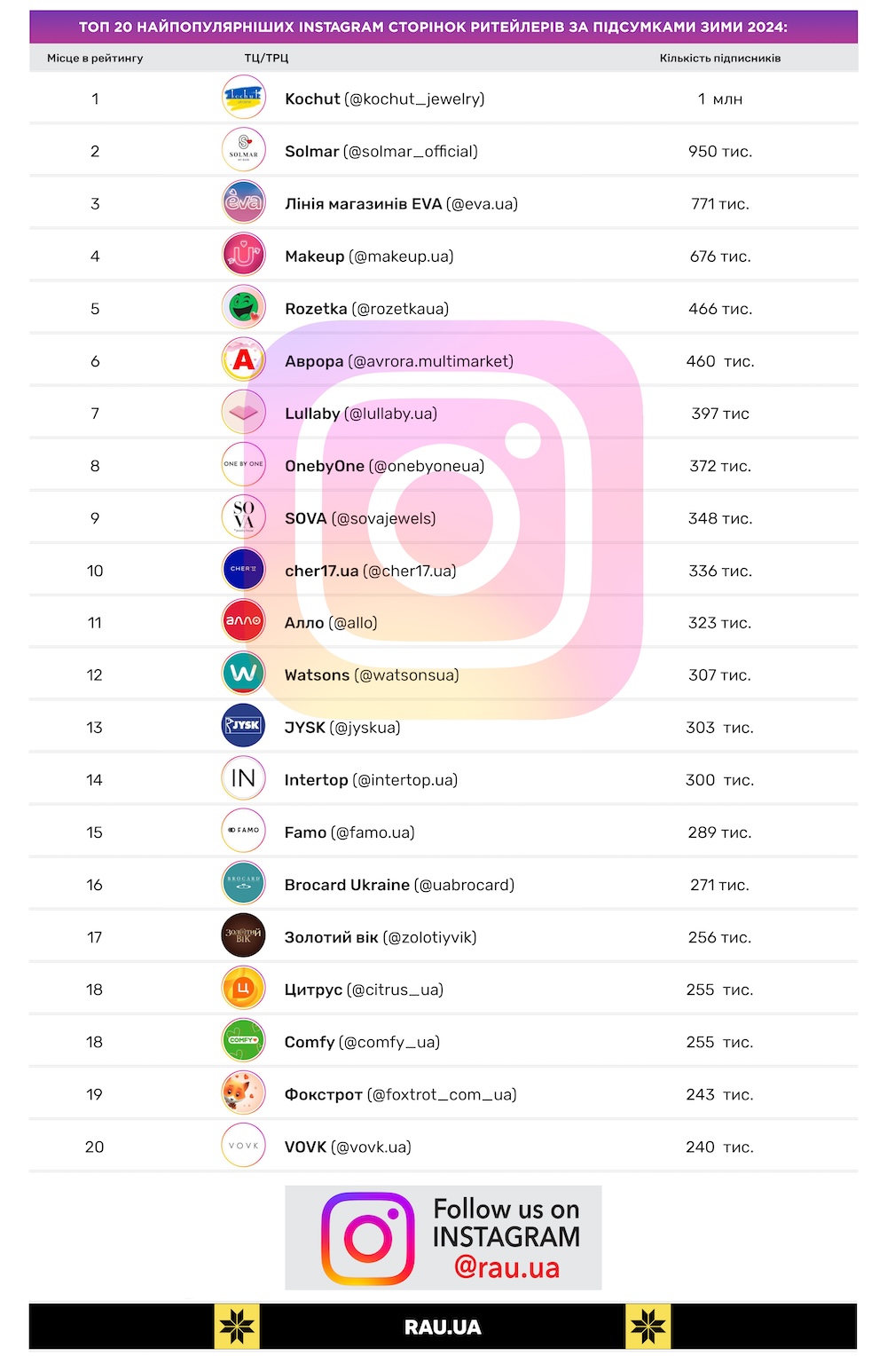 А вот такие опытные ритейлеры как Kachorovska, Dnipro-M и Эпицентр на этот раз покинули ТОП 20 лидеров в Instagram.