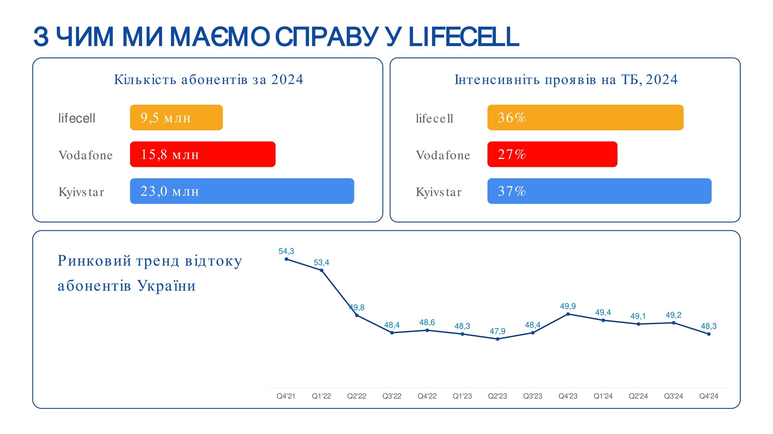 Исторически сложилось, что lifecell – самый молодой телеком-оператор на рынке Украины. Мы самые маленькие с точки зрения количества абонементов и дохода. По данным lifecell, в 2024 году было 9,5 млн абонентов, Vodafone – 15,8 млн, Київстар – 23 млн.