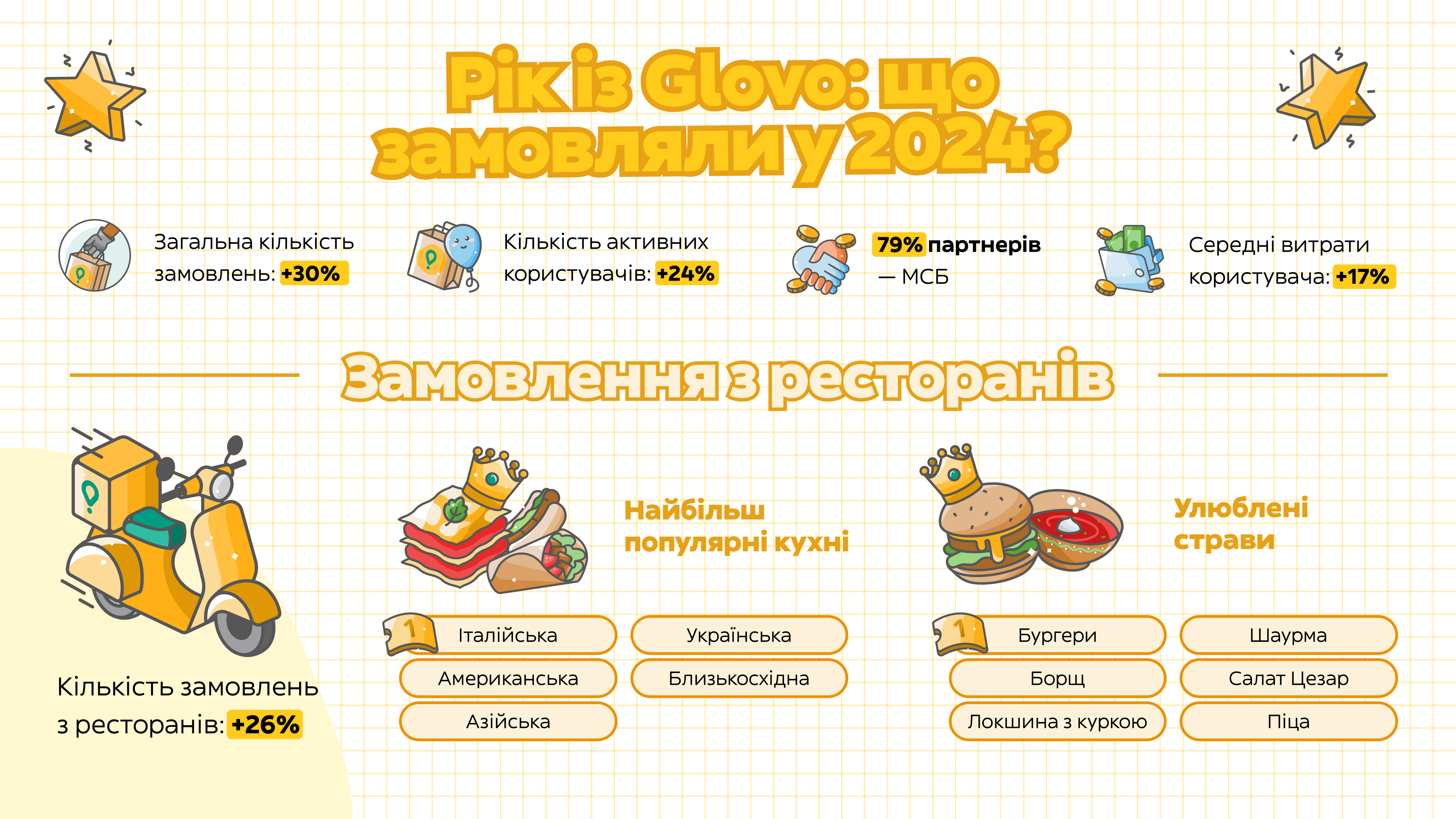 В ежегодном отчете Glovo Delivered 2024 для Украины компания подвела итоги работы за прошлый год. Так, в 2024 году украинцы сделали на 30% больше заказов и заказали на 39% больше единиц товаров, чем в 2023-м. Количество пользователей, сделавших по крайней мере один заказ в 2024 году, выросло на 24%, при этом средняя сумма заказа выросла на 17%. Интересно, что самым загруженным днем в приложении Glovo стало 8 марта и именно тогда пользователи сделали наибольшее количество заказов.