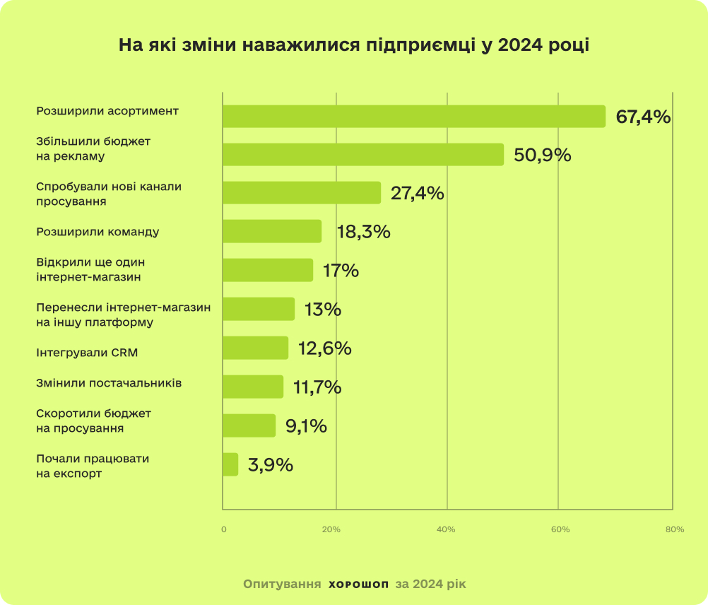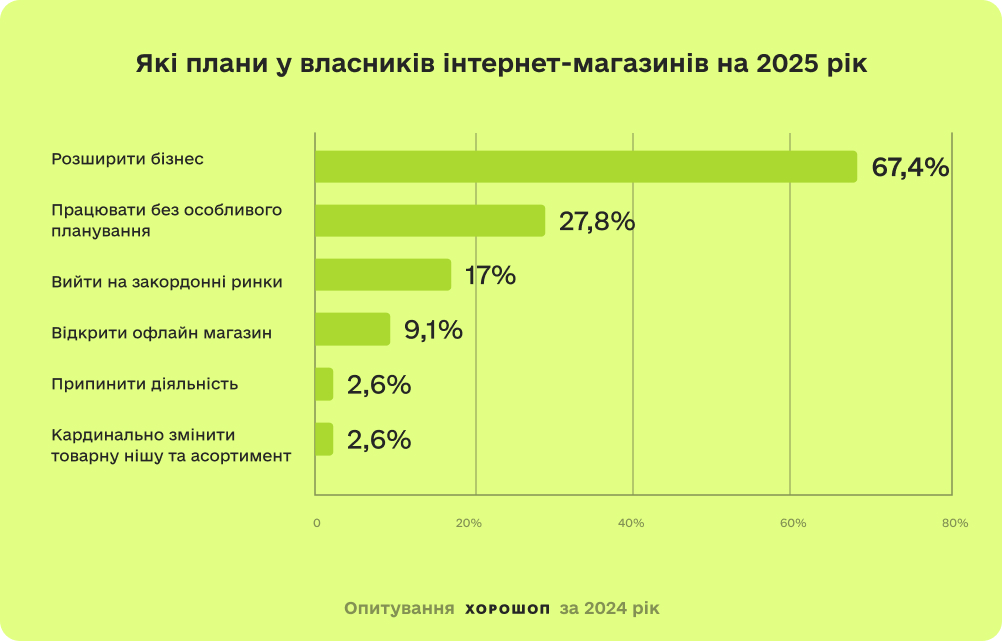 Несмотря на вызовы, с которыми столкнулся украинский e-commerce в 2024 году, большинство предпринимателей настроены на развитие. Желание расширить бизнес выразило 67% владельцев интернет-магазинов. Среди потенциальных направлений расширения они назвали выход на зарубежные рынки и открытие офлайн-магазина.