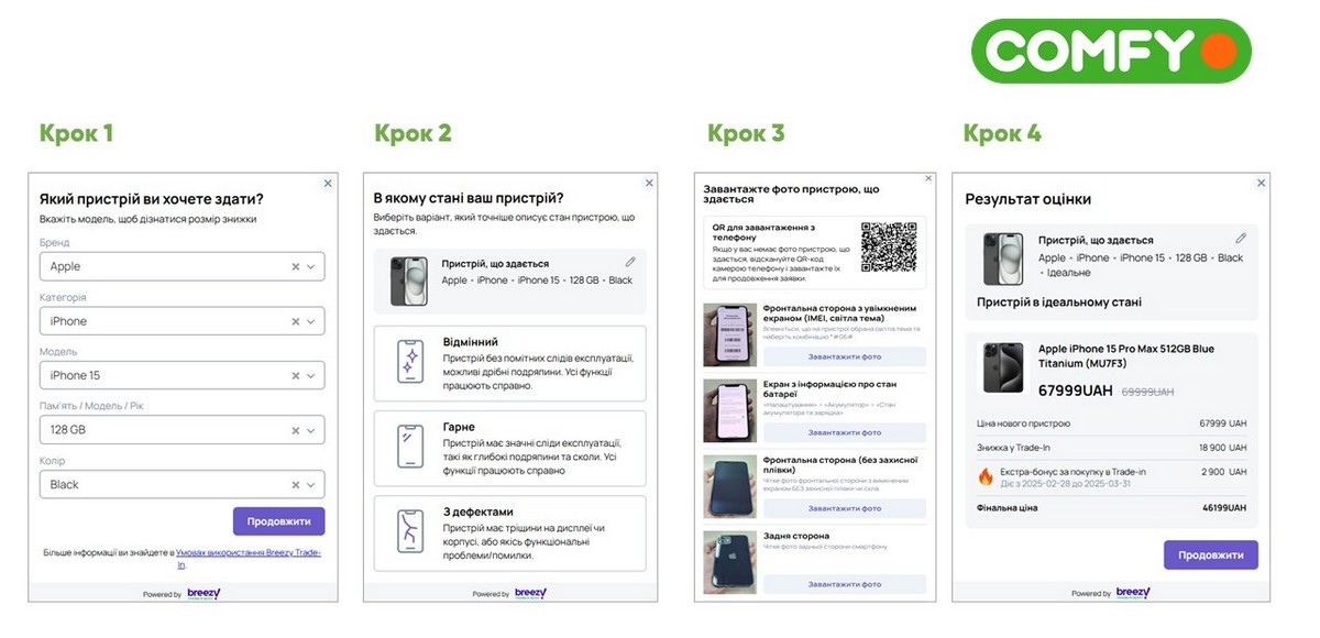 Сеть Comfy первой запустила инновационный сервис точной онлайн-оценки гаджетов в trade-in. Используя искусственный интеллект, можно оценить устройство без обращения в магазин и использовать средства на последующую покупку в любом магазине сети. Расположенный в карточке товара калькулятор Trade-in позволяет определить точную цену б/у устройства. Онлайн-оценка работает пока для смартфонов, но в ближайшее время будет распространяться на другие виды цифровой техники. Выкупленные устройства будут обновлены техническим партнером trade-in, компанией Breezy, и возвращены на рынок как подержанная техника.