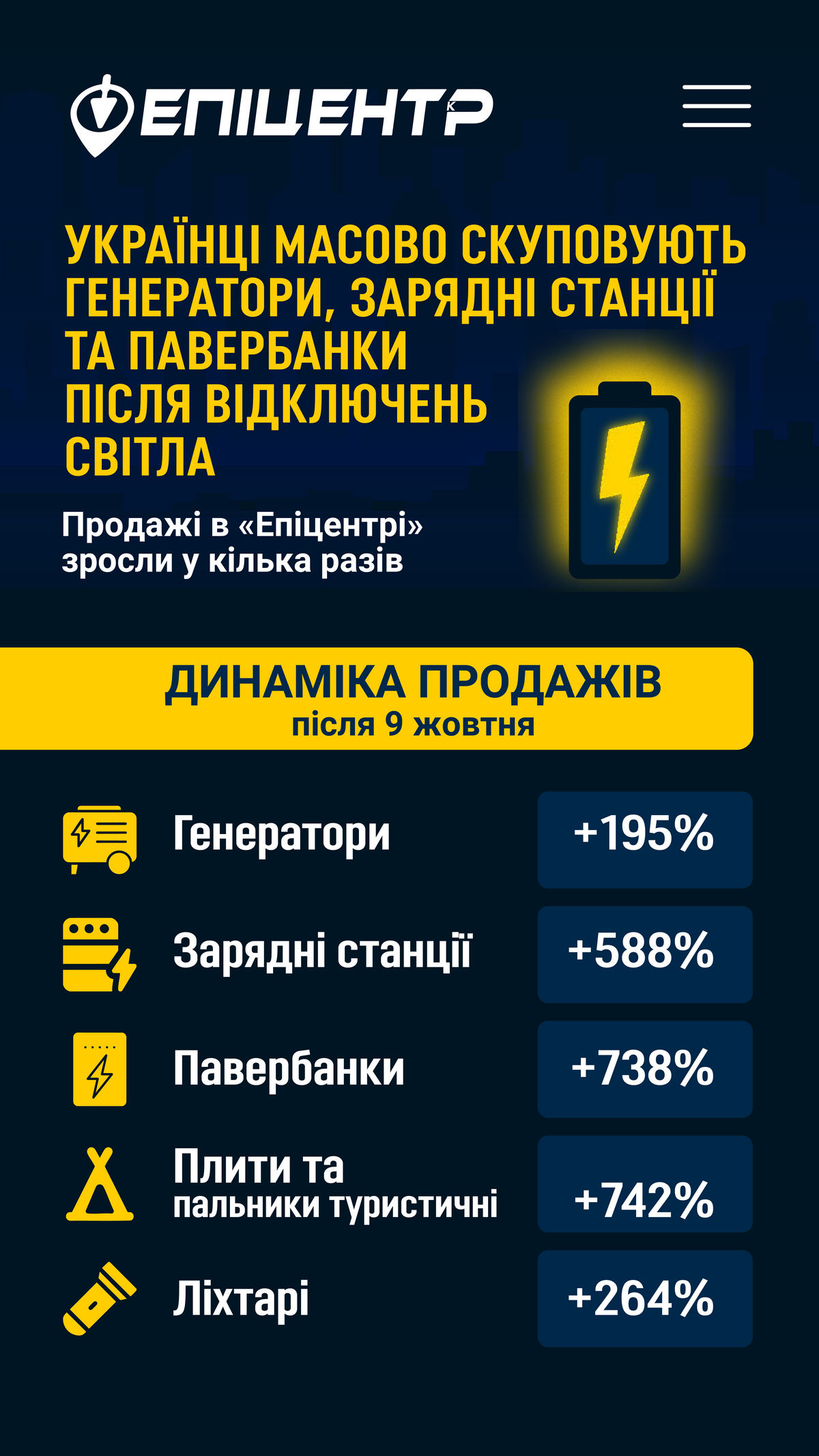 После массированных обстрелов энергетической инфраструктуры и веерных отключений света по Украине сеть торговых центров Эпицентр зафиксировала резкий рост спроса на товары для автономного энергообеспечения. Так, уже на следующий день после произошедших в ночь с 9 на 10 октября воздушных атак продажи таких товаров выросли почти в четыре раза. Более всего возрос спрос на павербанки, горелки и туристические плитки (в 8,4 раза), зарядные станции (почти в 7 раз), а также фонари и газовые баллоны (в 3,7 раза). Существенно возросли и объемы реализации генераторов, способных обеспечить энергетическую автономность частных домов. Их продажи в сети Эпицентр увеличились почти втрое. Кроме того, положительная динамика объемов реализации наблюдалась в категориях свечей (+60%), батареек (+39%) и аккумуляторов (+20%).