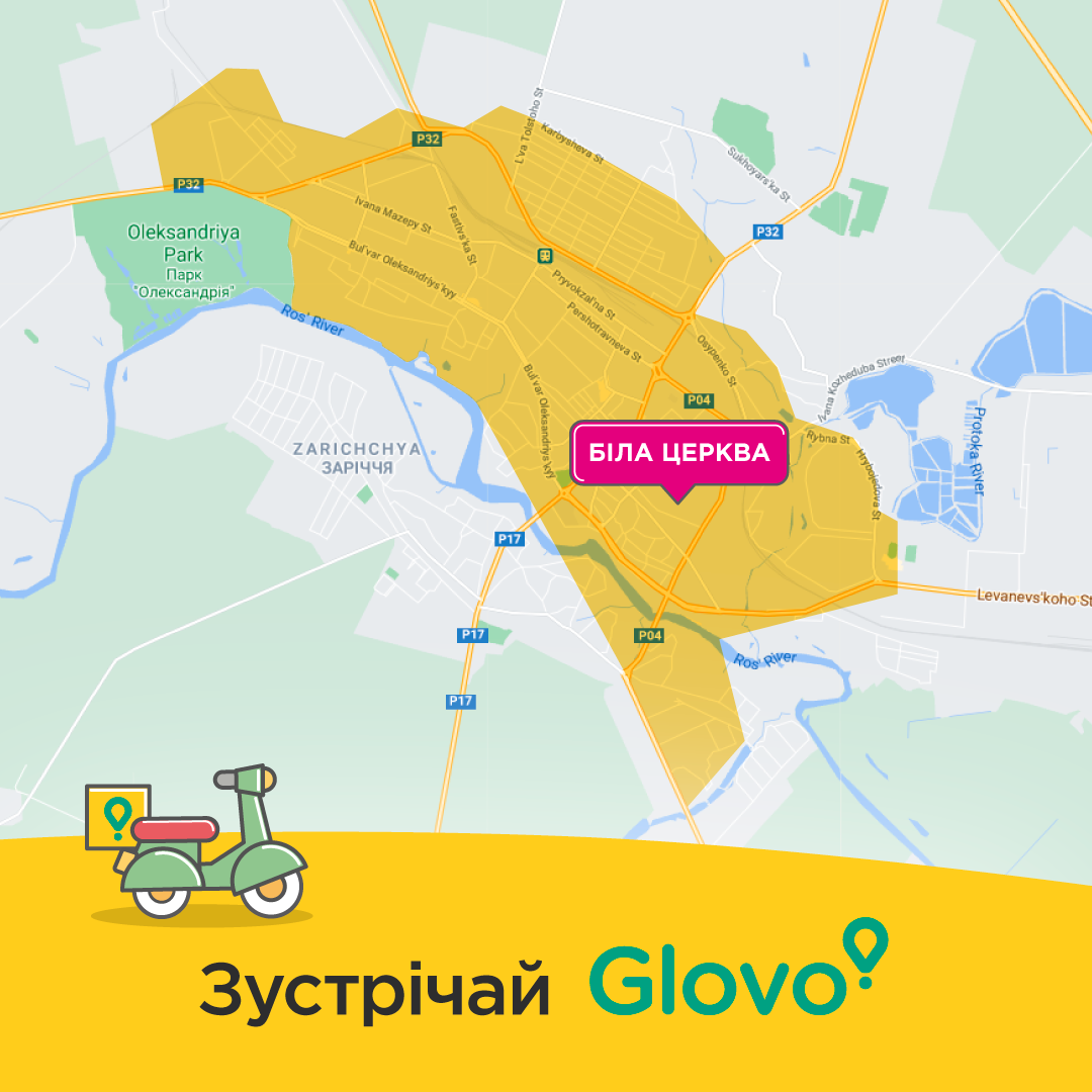С 25 марта Glovo расширил зону покрытия в Киевской области, добавив 29 город – Белая Церковь. В зону покрытия доставки вошла центральная часть города, между рекой Рось на западе и улицей Карбышева на востоке, а с севера она простирается от парка «Александрия» к улицам Таращанской и Некрасова на юге. Сервис Glovo будет доступен для заказов ежедневно с 10:00 до 22:00.