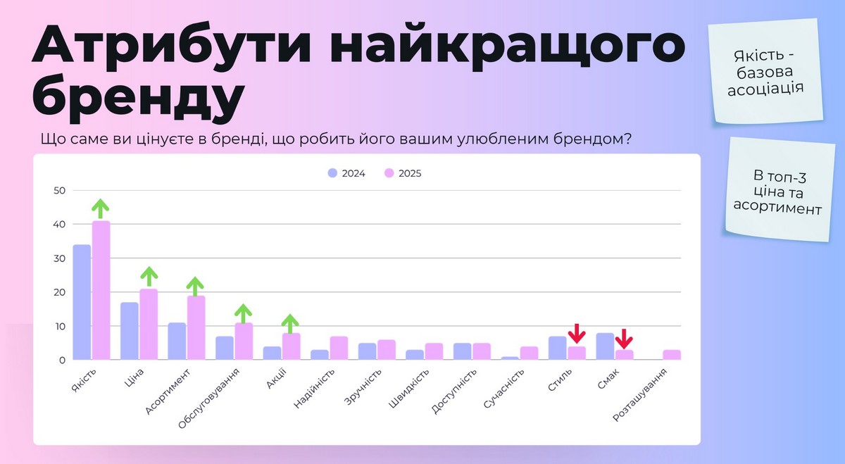 Согласно результатам исследования Lovemarks 2025, самые любимые бренды имеют общие характеристики, которые формируют их эмоциональную привлекательность. Безусловным лидером среди атрибутов является качество – оно выступает базовым ожиданием, своеобразной «гигиенической нормой». Далее в тройке – цена, которая должна быть не просто низкой, а релевантной к ценности, и ассортимент, позволяющий удовлетворить различные потребности.
