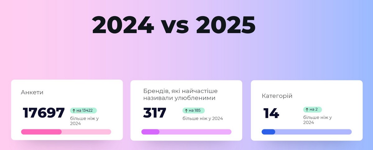В рамках исследования было опрошено более 17 600 респондентов, что позволило получить статистически обоснованный и репрезентативный массив данных. Охвачено 317 брендов в 14 потребительских категориях, что позволило глубже погрузиться в эмоциональную картину восприятия брендов в Украине. Важно отметить: в этом году выборку значительно расширили, что повысило достоверность результатов.