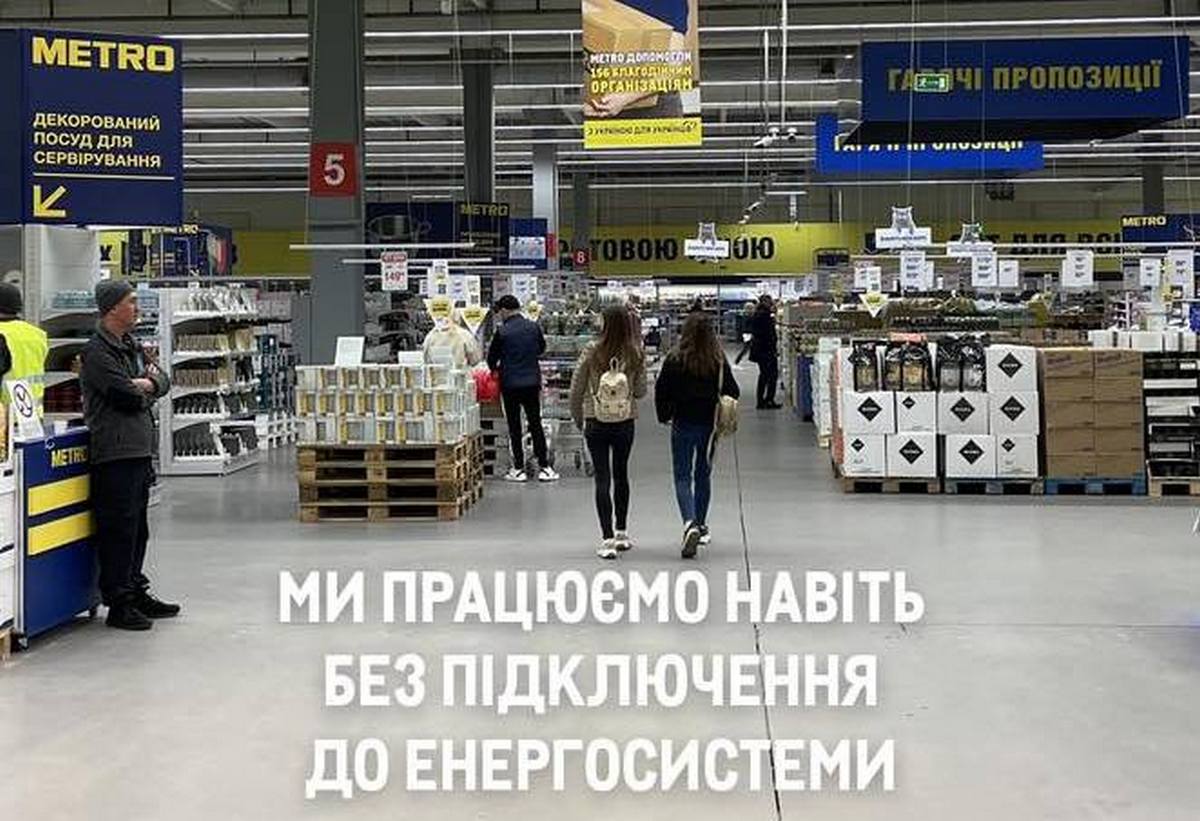 Продолжает работу в условиях полного отключения электроэнергии также Metro, обеспечивающих питание электросистемы гипермаркетов путем использования дизельных генераторов. Актуальний розклад та адреси магазинів можна переглянути за ссылкой. В Киеве таких четыре гипермаркета: