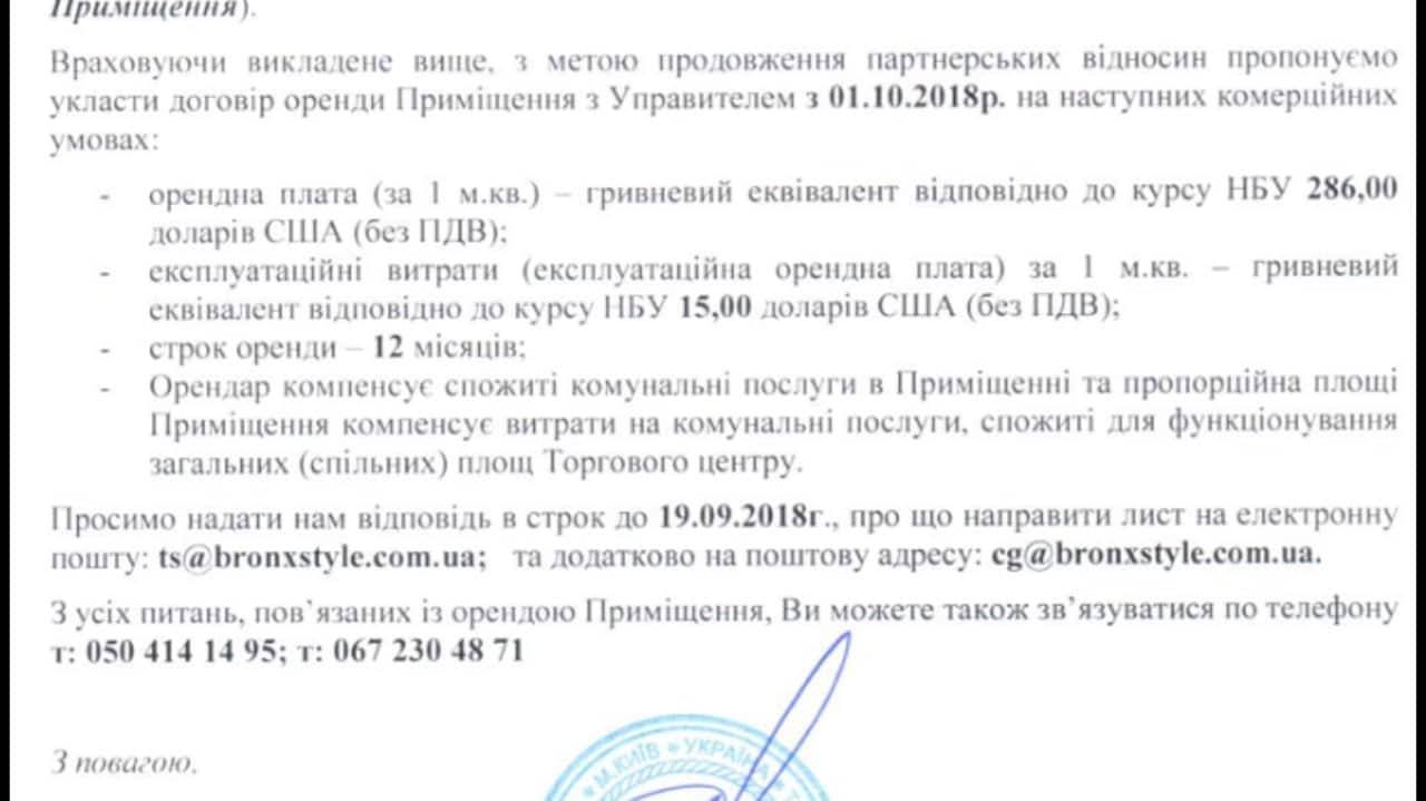 В распоряжение редакции RAU также попало одно из предложений новой управляющей компании о подписании договора аренды на обновленных условиях. В документе арендатору предлагают подписать договор аренды на год с ежемесячной арендной платой в $286 за кв. м без НДС + плата за эксплутационные расходы в размере $15 за кв. м в месяц.