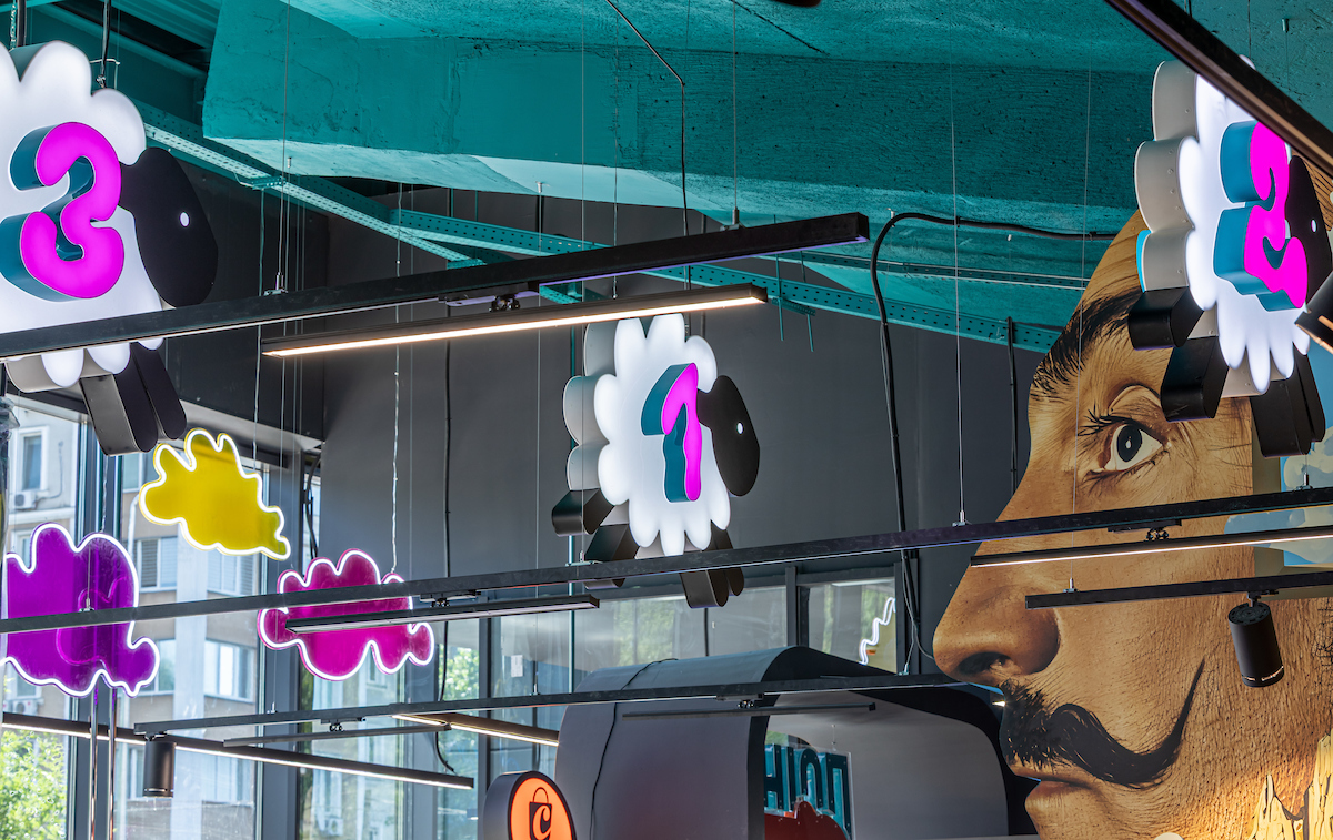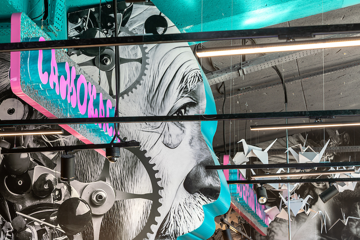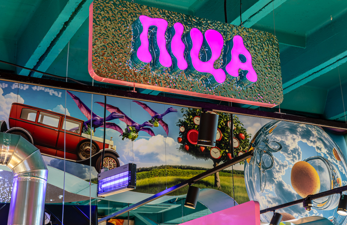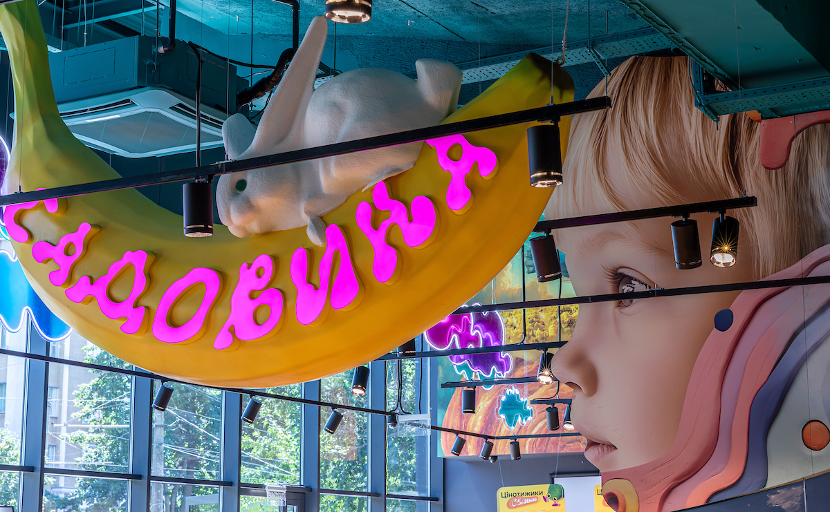 Дизайн сочетает в себе сюрреализм и фэнтези. Красочные и четкие элементы чередуются с размытыми и причудливыми образами – это помогает передать ощущение сновидений и подсознательных символов. В пространстве нового магазина ничего не является буквальной репрезентацией – все заигрывает с метафорами: зеркальный фасад – вход в сон, зайчик на банане – абсурдная ночная аллюзия, а кассы с овечками – зона пробуждения.