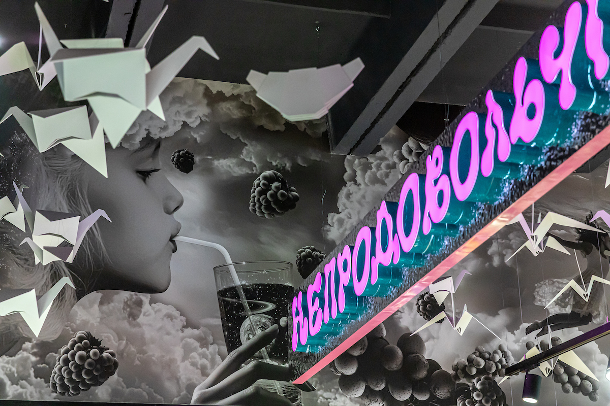 Потолок украсили звездным небом, с которого падает человек, чтобы передать знакомое многим ощущение падения во сне. Не забыли и о тех, кто видит только черно-белые сны – именно в этой палитре оформлена зона алкоголя. Над островом с мясными продуктами разместили динамический артобъект – спираль снов; возле нее отображаются образы, которые, по легендам, рождены во сне.