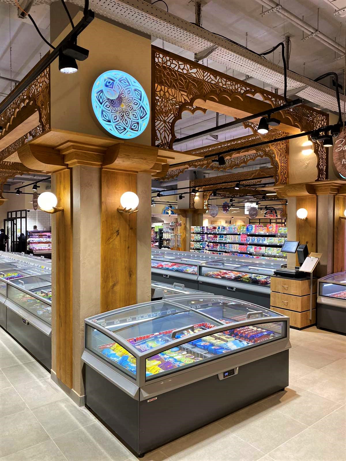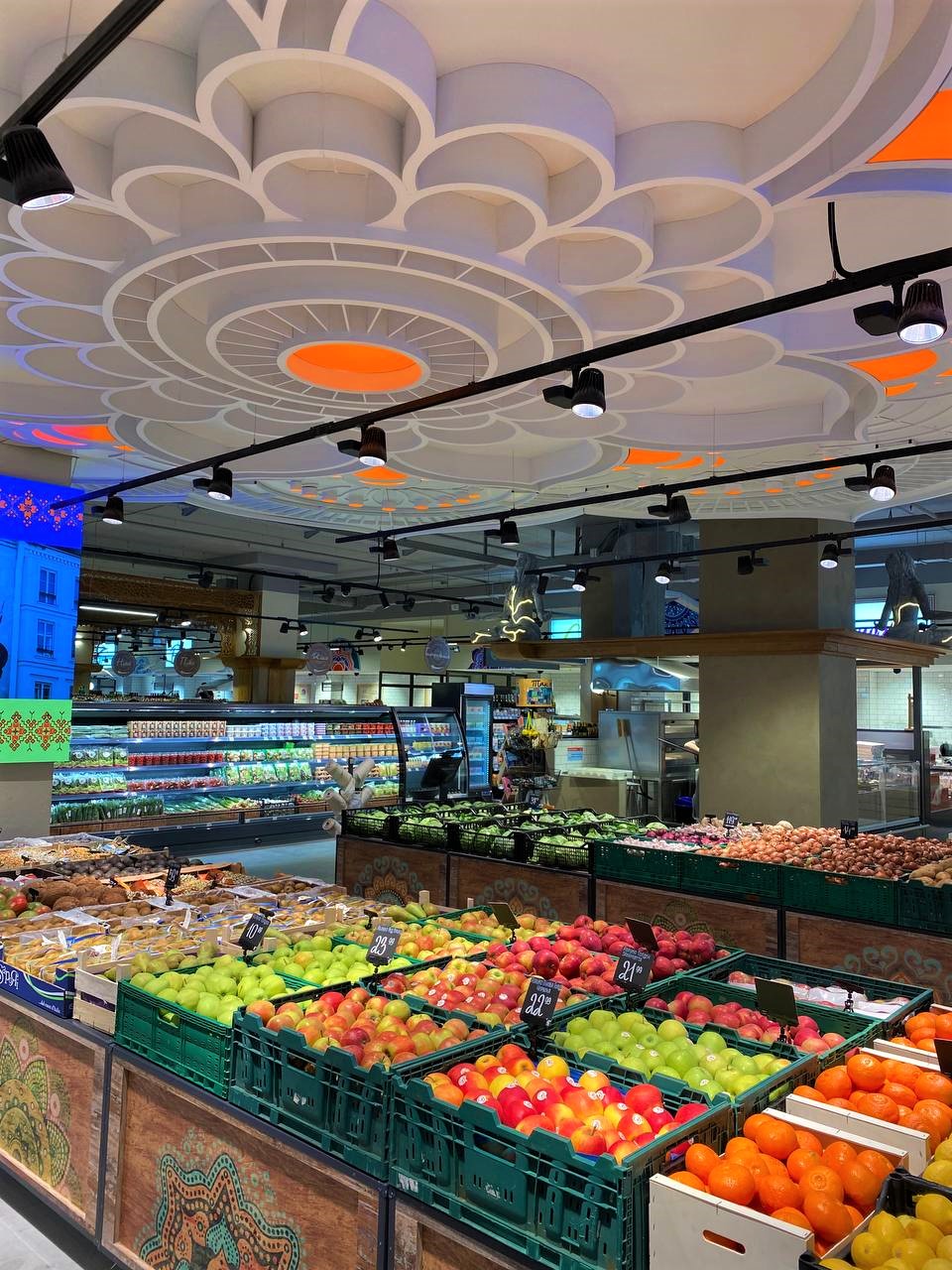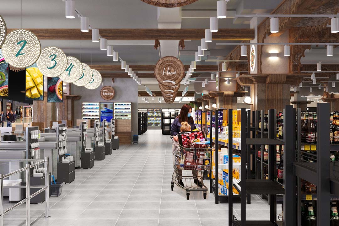 В супермаркете площадью 1400 кв.м работает 6 обычных касс, 6 самокасс и 2 – табачные. Также можно заказать доставку продуктов на дом или их самовывоз из супермаркета. Постмодерновый магазин создан с несколькими shop-in-shop, которые отличаются от других магазинов сети, но, в то же время, сохраняют присущий им навигационный интерфейс и опыт пользователя.