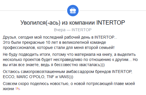 Об уходе топ-менеджер сообщила 31 августа на своей страничке в социальной сети Facebook: “Друзья, сегодня мой последний рабочий день в Intertop… Это были прекрасные 10 лет в великолепной команде профессионалов, которые стали для меня второй семьей! Не буду подводить итоги, потому что материала на книгу, а выделить несколько проектов будет несправедливо по отношению к другим… Но вы итак все знаете, ведь я бессовестно хвасталась))) Остаюсь самопровозглашенным амбассадором брендов Intertop, Еcco, Marc O’Polo, TNF и Vans)))”, – отметила Толочина.