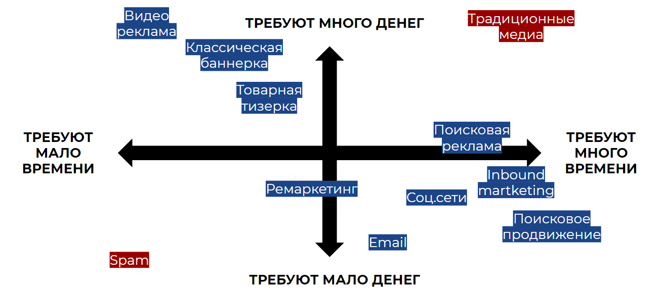 Вертикальная ось – ресурс денег. Горизонтальная – ресурс времени. Как видно на матрице, существует определенная закономерность – чем меньше рекламный канал требует времени, тем больше он требует бюджета. То, что сверху – нас не интересует, так как денег у нас нет. Мы не будем говорить про видеорекламу, про классическую баннерку и товарную тизерку. Это не те каналы, которые стоит использовать интернет-магазинам, которые находятся на начальной стадии развития или в кризисе. Тоже самое о традиционных медиа – вся наружка, ТВ и так далее – это не наша история. Мы будем говорить о том, что на графике снизу – как видите, не такой уж большой набор рекламных инструментов: