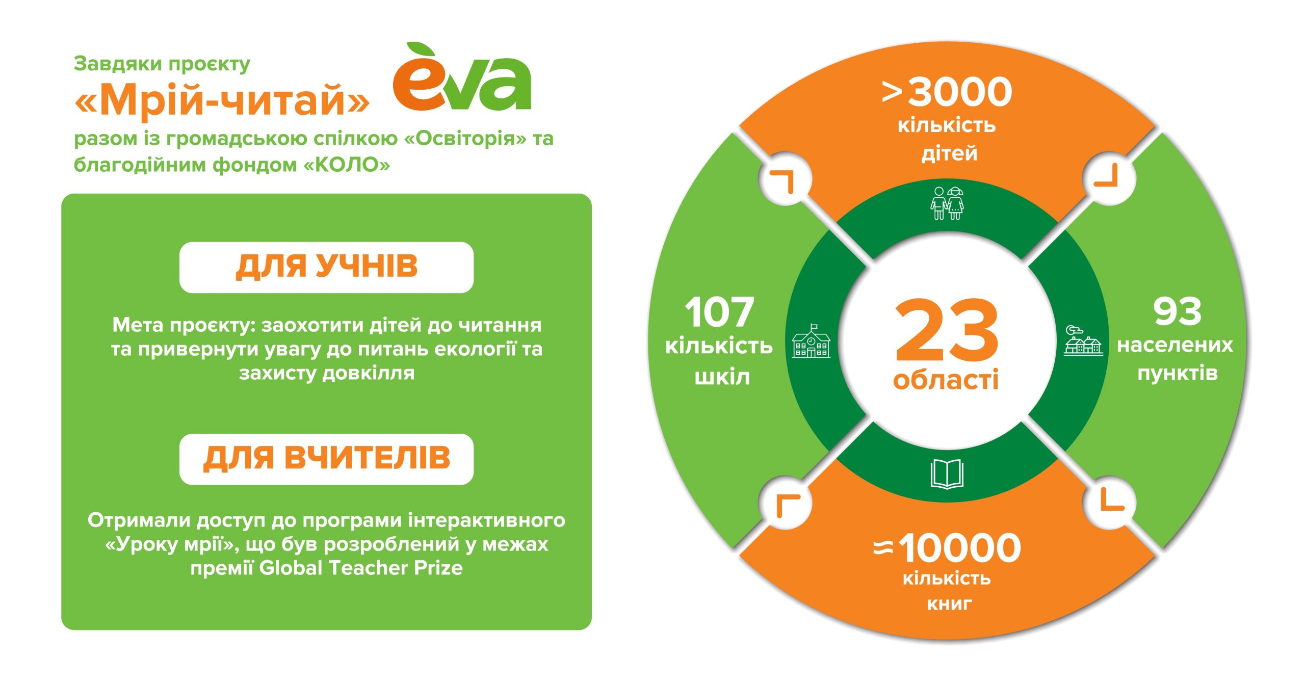Всеукраинская сеть магазинов EVA успешно воплотила в жизнь проект «Мечтай-читай» для учащихся начальных классов в школах, расположенных в селах и маленьких городках. В рамках проекта, организованного совместно с общественной организацией «Освитория» и благотворительным фондом «Коло», EVA отправила серию детских рассказов «Приключения Евы и Рудаськи» в школы в 23-х регионах Украины.