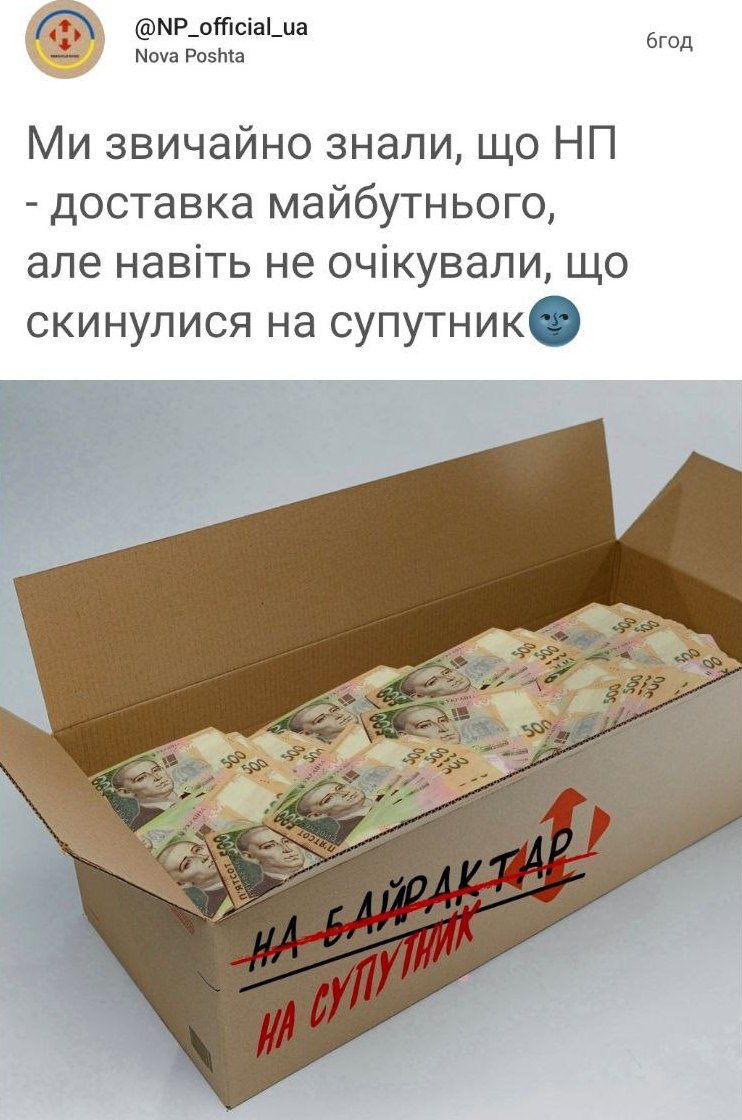 Нова пошта также скинулась на байракторы спутник Притуле, о чем с удовольствием похвастались.