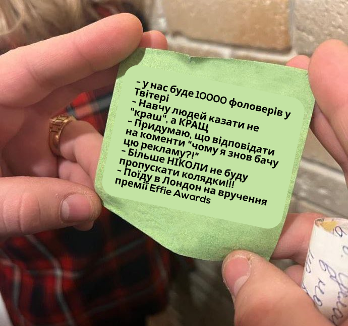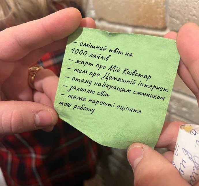 У SMM-щика Prom.ua тоже списочек нашли. Он мечтает наконец начать вести “твитор”, превращать все посты в мемы, ноль правок и чтобы подписчиков было “как хороших русских”. Последнюю шутку объясните кто-то в комментариях в соцсетях RAU.