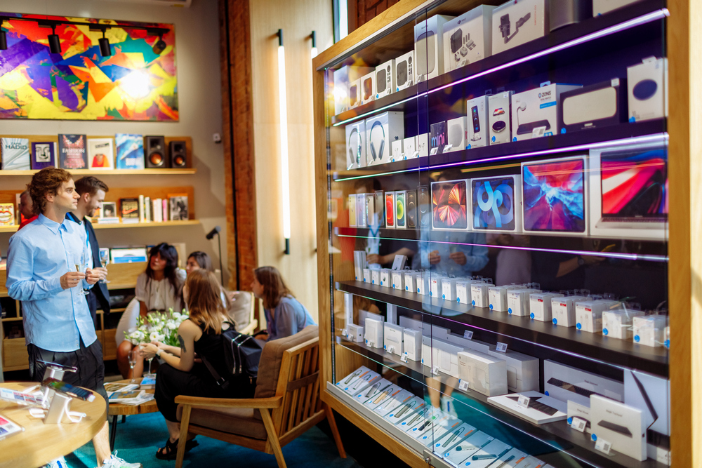 Мы хотели сделать «пространство», в котором клиенту будет классно, интересно и комфортно. Где он сможет увидеть часть нашего мира, познакомиться с нашим “лайфстайлом“. Да, мы фанаты бренда Apple, и конечно здесь вы сможете приобрести любой их товар. Но кроме этого мы сделали так называемый «аналоговый уголок», где представлено много классных «настоящих, нецифровых» вещей.