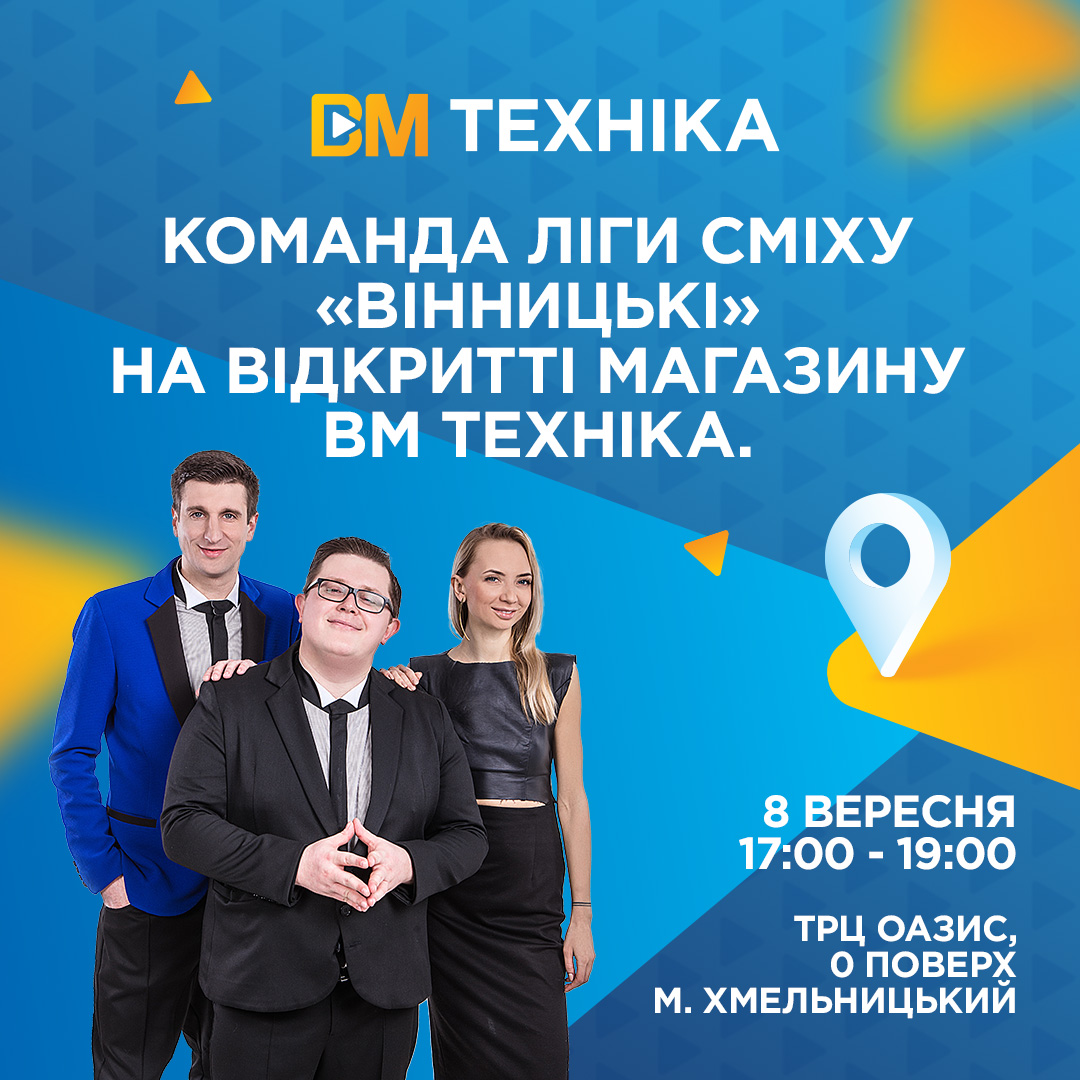 8 сентября по случаю открытия магазина ВМ Техника, с 17 до 19 часов, в ТРЦ Оазис состоится выступление команды лиги смеха “Винницкие”.