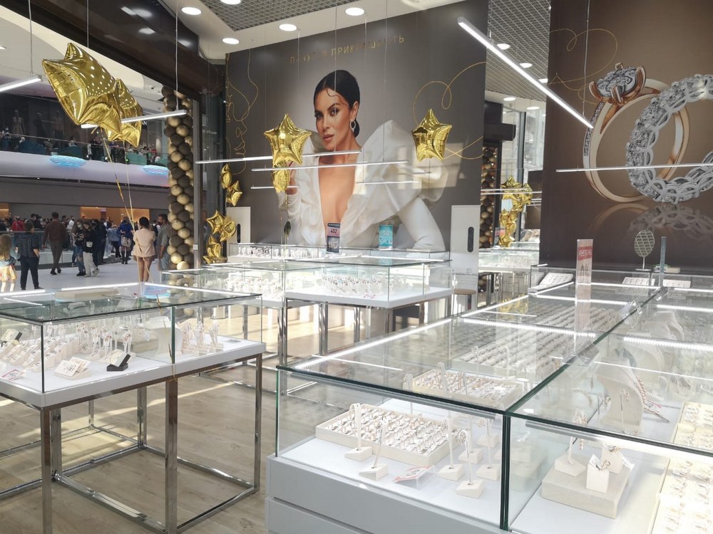 В магазине представлены совершенно новые форматы витрин, появились интерактивные (выдвижные) витрины для серебра. Сделан акцент на бренд-зону, которая создает объем и воздушность в пространстве.